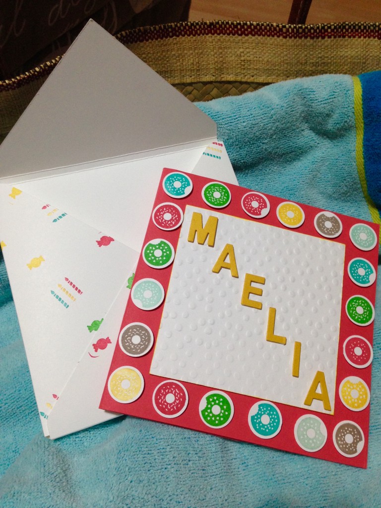 Le thème était nouveautés du catalogue et été. J’avais donc une grosse envie de couleurs vives, les in color 2015-2017 sont top pour ça (fraicheur pastèque est mon ptit chouchoux!) et le set de tampons « Sprinkles on top » et « fêtes toutes faites » pouvaient faire 1 truc super sympa pour immortaliser les 3 ans de mon autre niece Maélia.