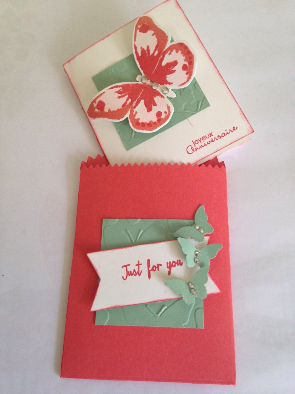 Pour mon papillon j’ai utilisé les encres : fraîcheur pastèque, tango mandarine et ptite pirouette.