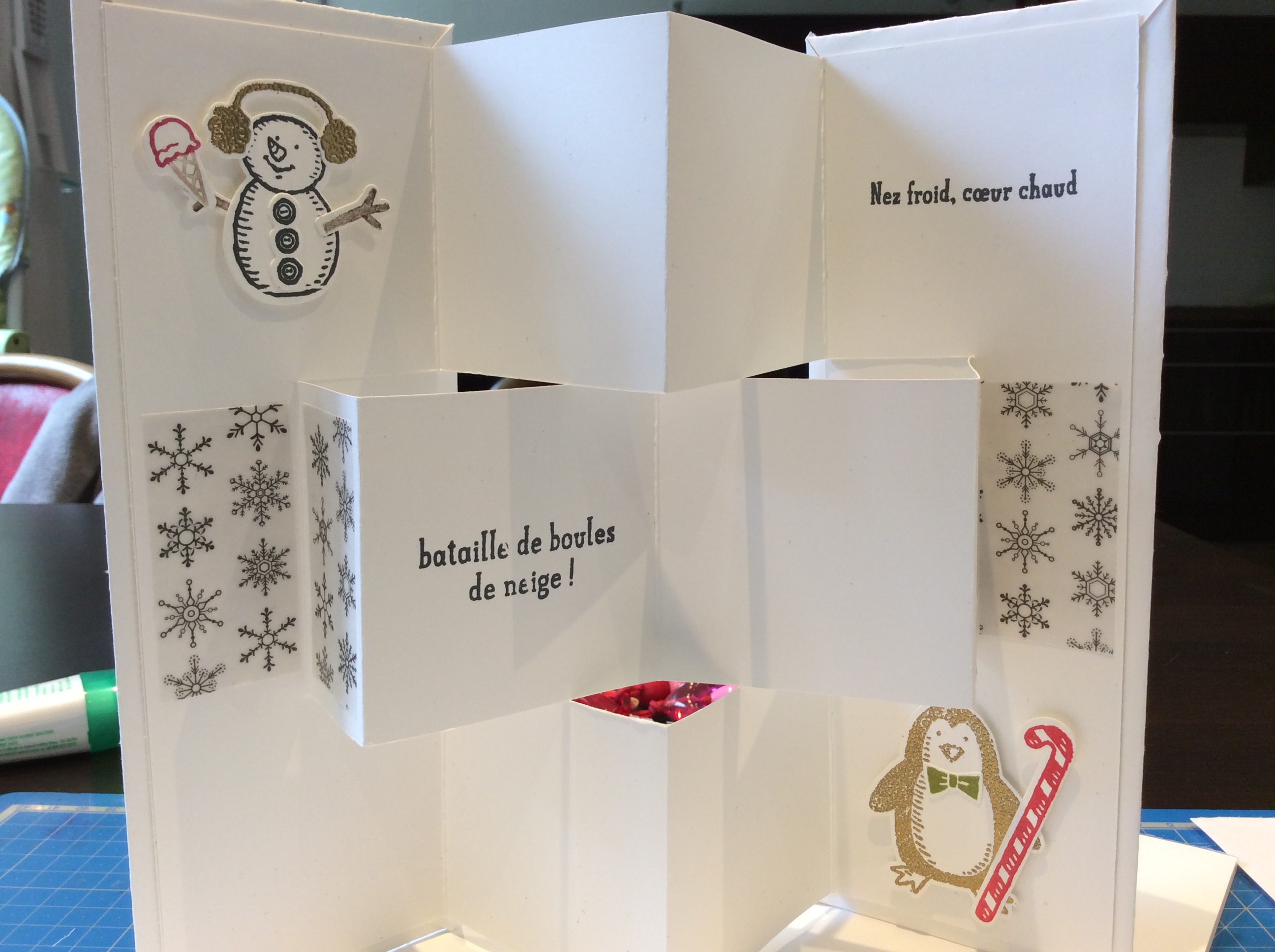 Donc moi, j’avais décider de travailler avec le set de tampon « Petit Bonhomme » et les papier de la serie « Design Spécialité Magie de Noel » accompagner de poudre à embosser Doré et du magnifique papier vélin Design Magie de Noel