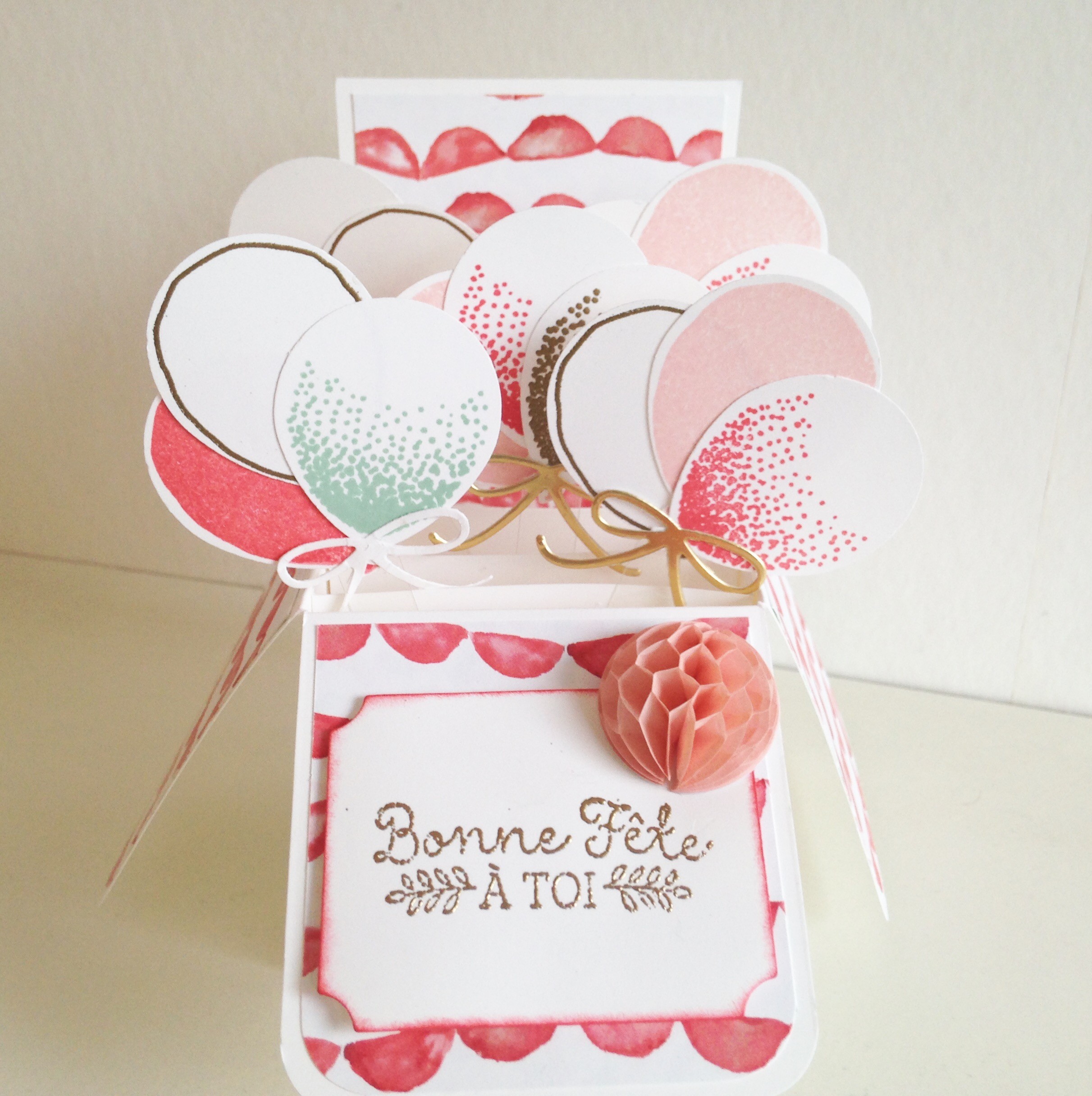 Je l’ai réalisé avec le set de tampons « Bouquet de ballons », le papier Design « Bouquet D’anniversaire », un ornement « Nid d’abeille », une étiquette de la série d’étiquettes « plein d’étiquettes », de l’embossage à chaud or et juste pour le ptit noeud tout mimi j’ai piqué la découpe de « mini sac de sucrerie » P171 du catalogue annuel