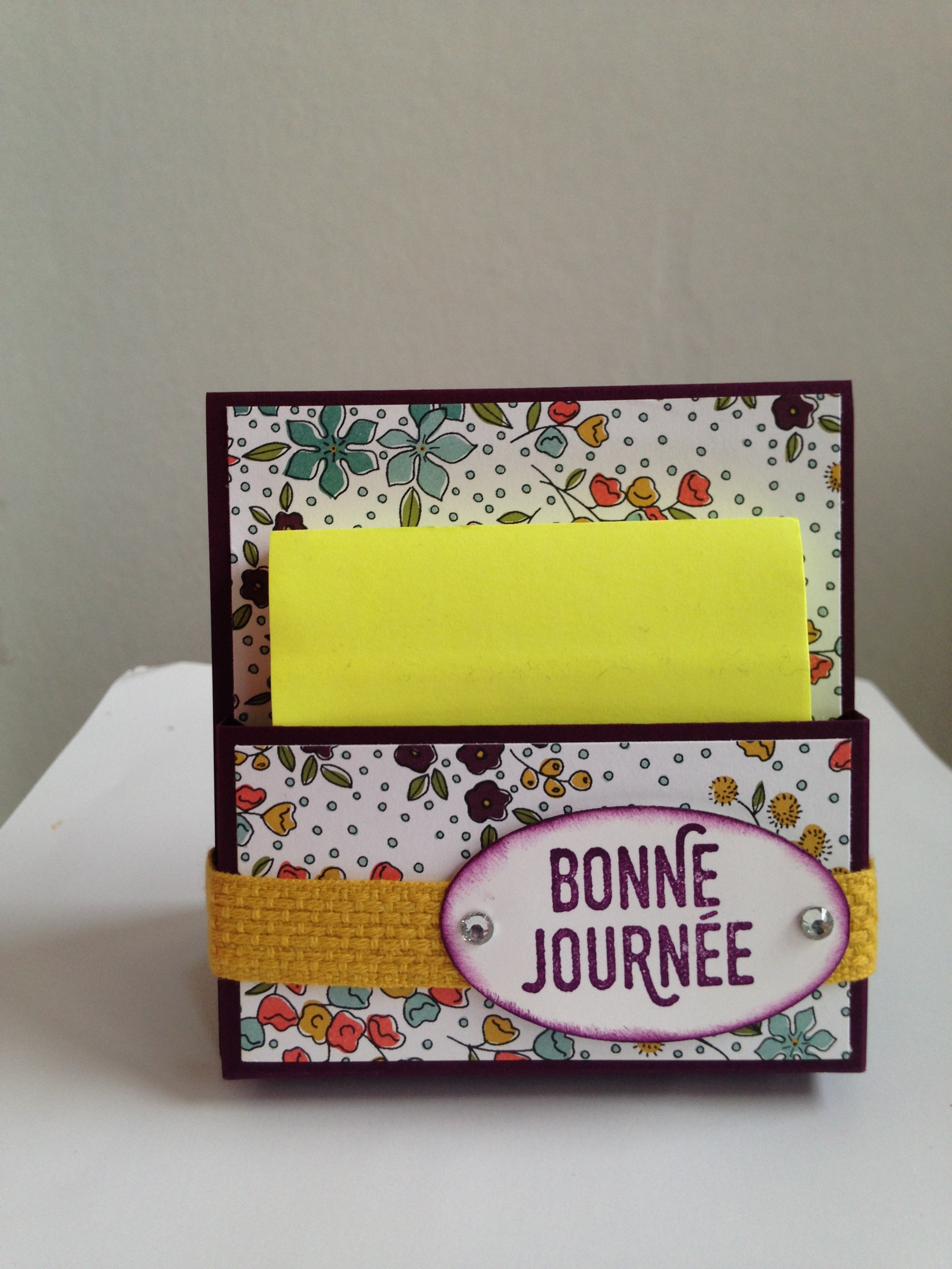 Et là, j’ai voulu faire un porte post-it pour l’orthophoniste de mon fils. Elle l’aide beaucoup et lui donne confiance en lui. Et mon fiston il a besoin de ça quand même…
