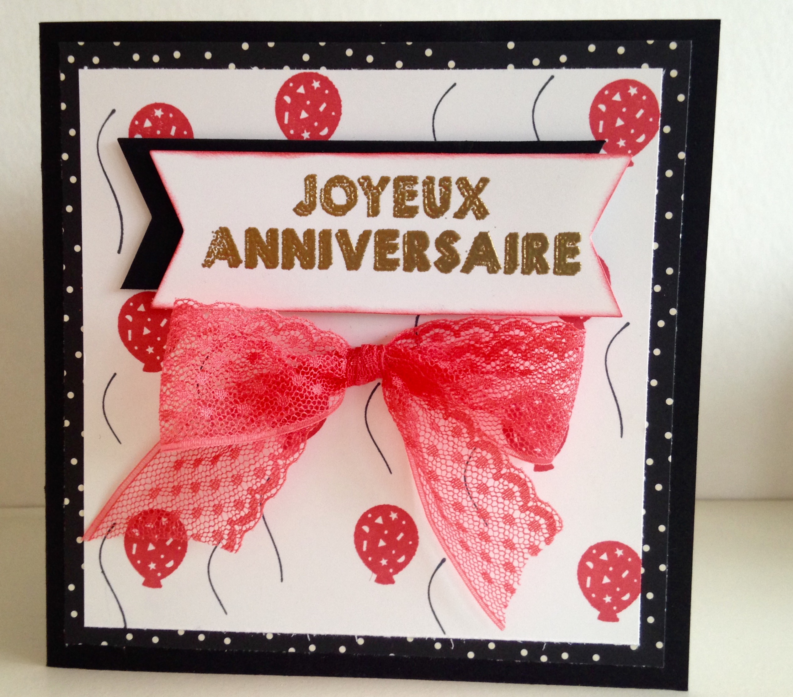 Voici ma version à moi de la carte tout en volume, j’ai souhaiter travailler avec le set de tampons « Fête du tonnerre » P5 du petit catalogue et encore 1 peu d’embossage à chaud or. Le tout accompagné du ruban dentelle fraîcheur pastèque