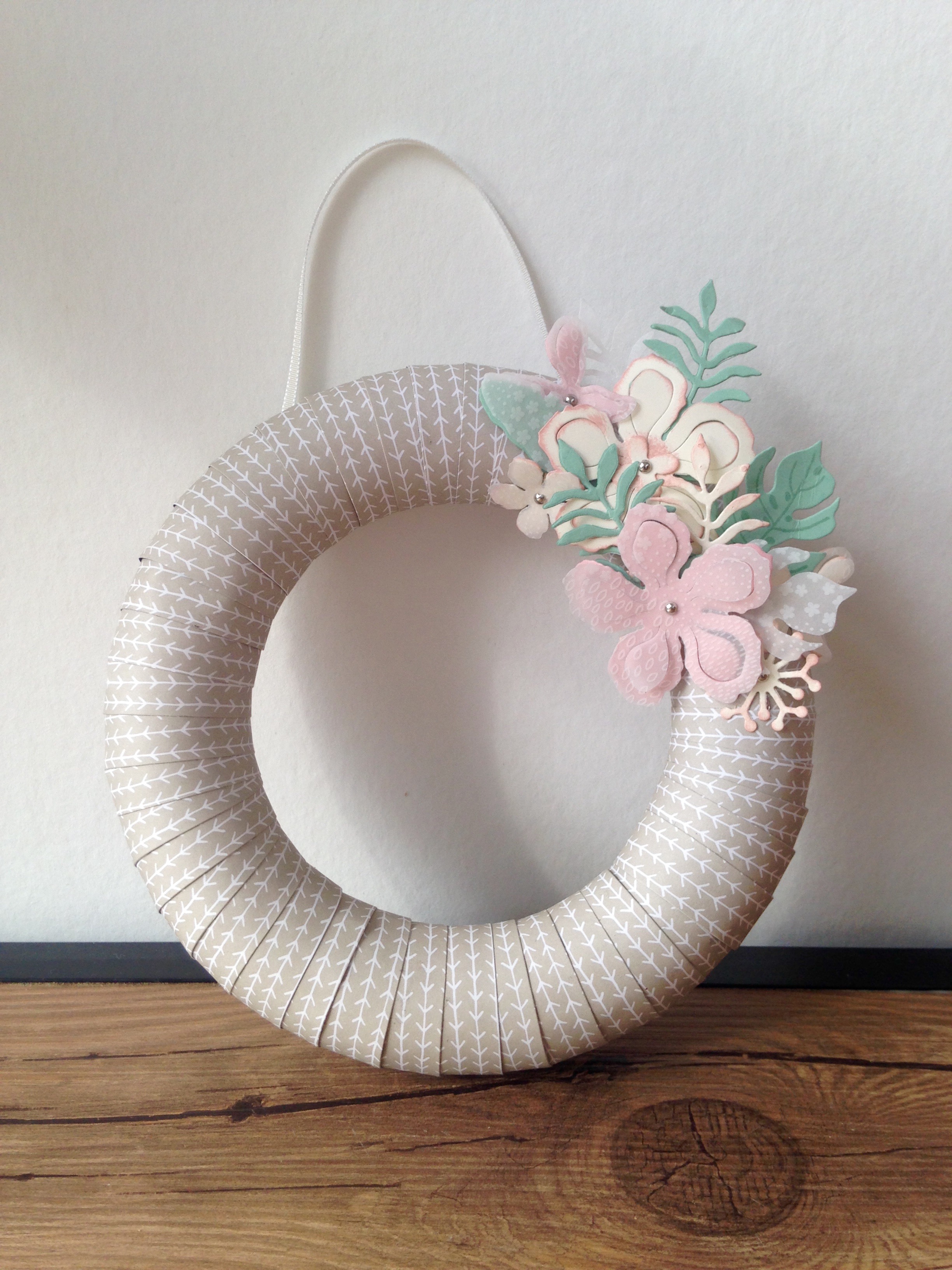 Pour recouvrir la couronne en polystyrène, j’ai utilisé une page du bloc de papier « Ma fête à moi » P5 du petit catalogue.