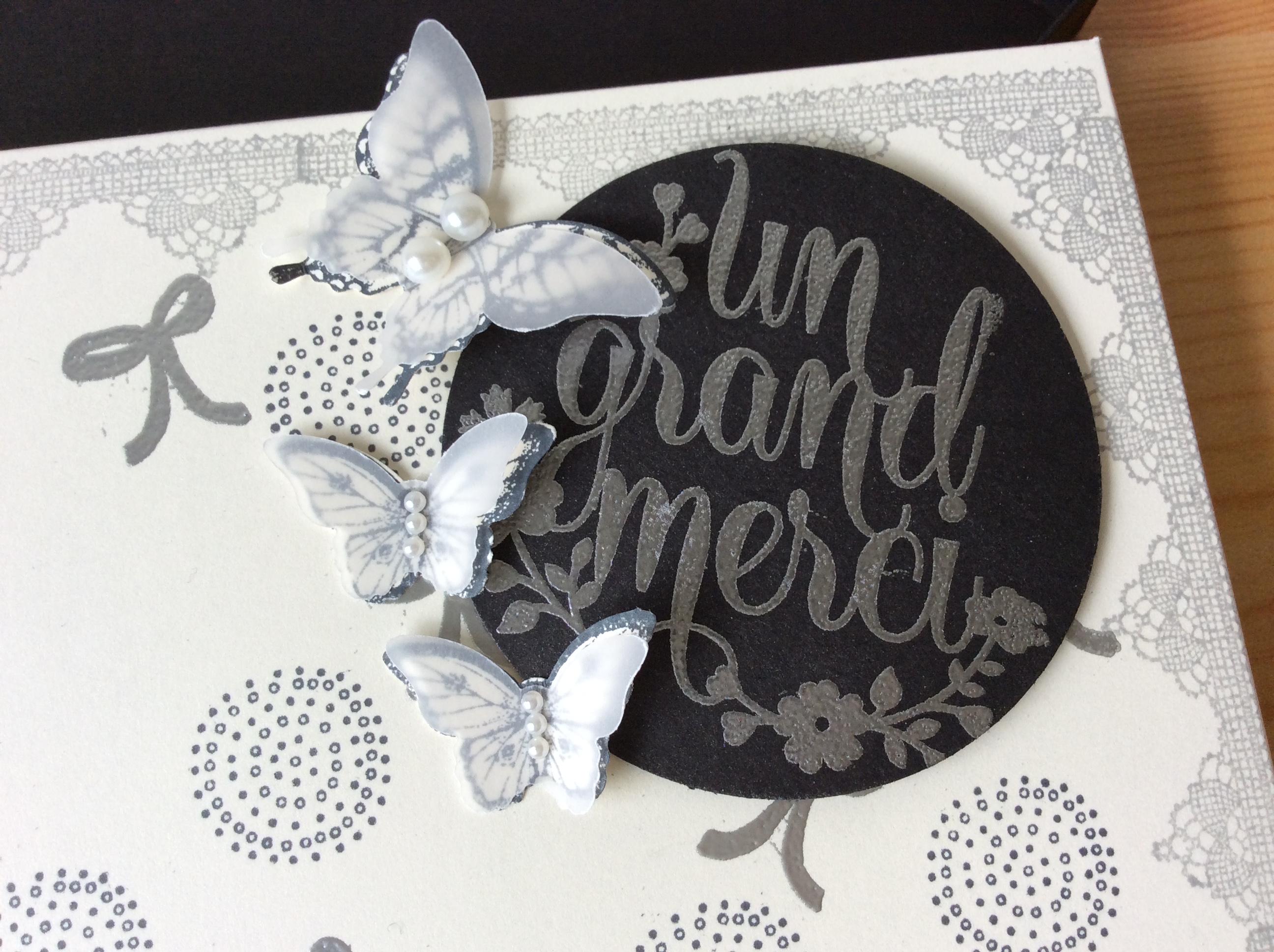 Pour les 2 boîtes, j’ai voulu faire mon fond de page à l’aide du set « tant de mercis » P 22 du set « Bouquet de ballons »P12 du catalogue printemps/été. Pour le ptit noeud trop mimi j’ai utilisé de la poudre à embosser Argent