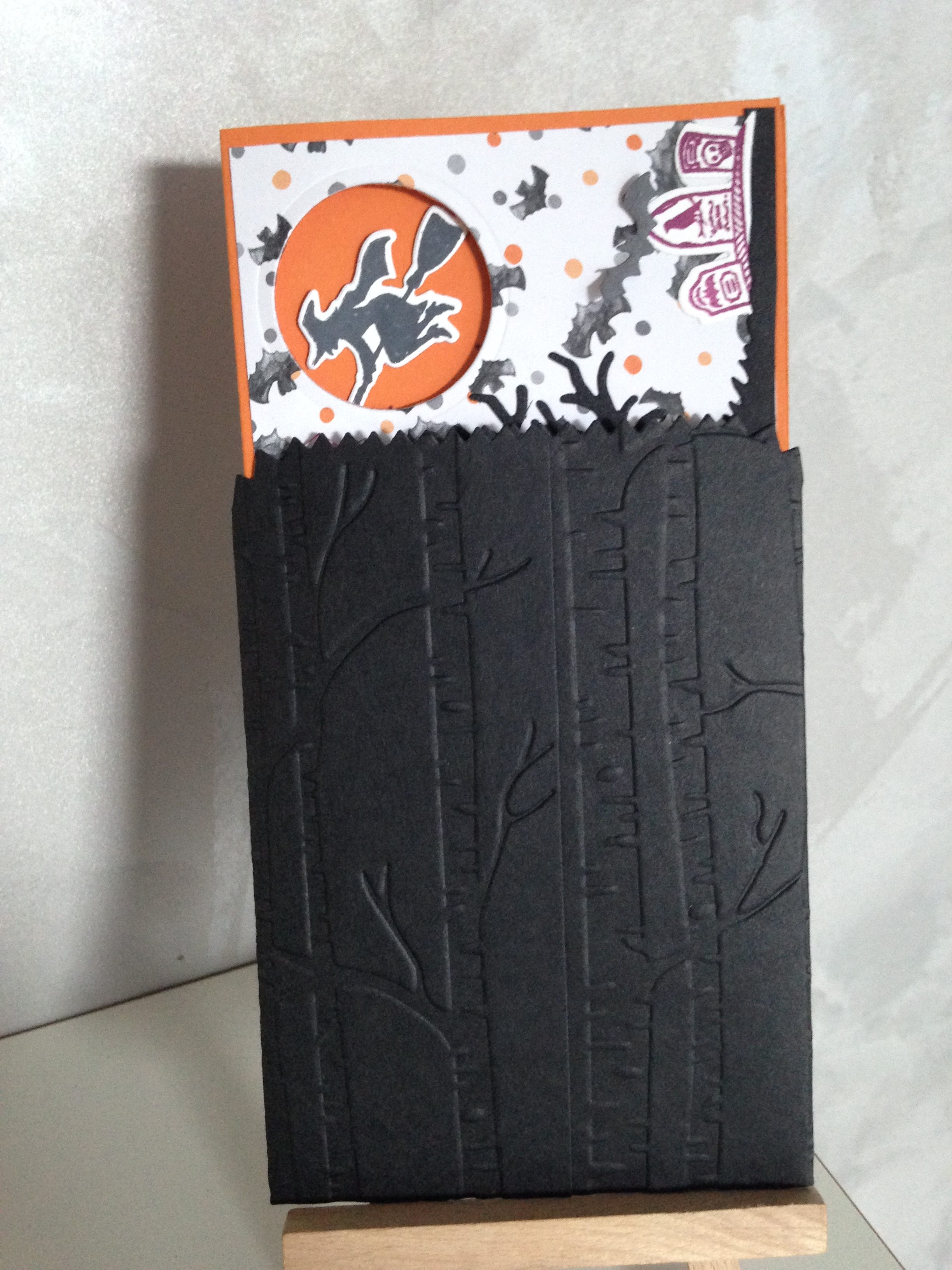 Une magnifique pochette relief arbre et un jeu de chauve-souris tampon et relief ! Excellent, ça donne des idées !
