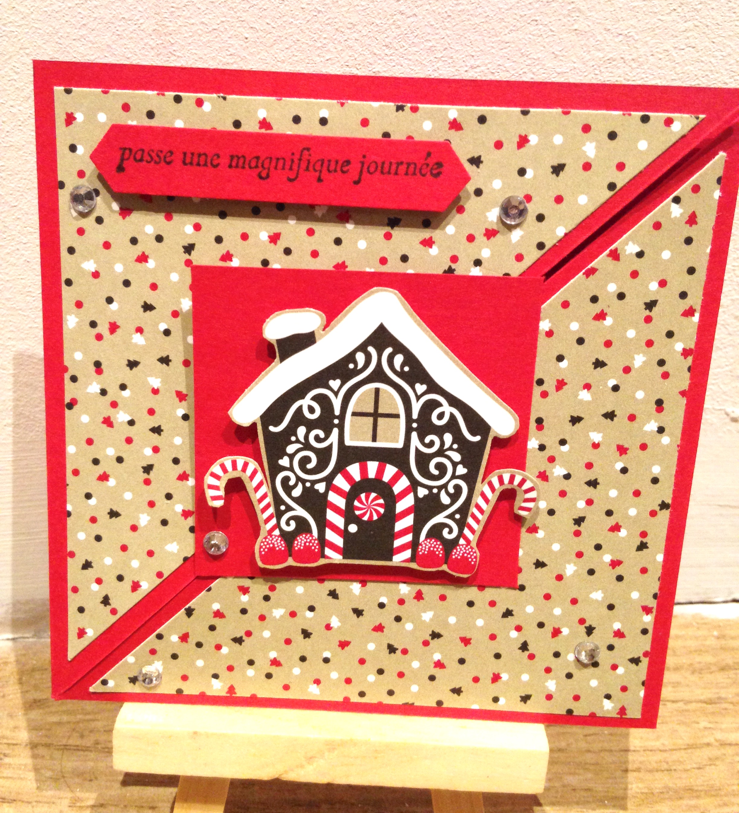 J’ai détouré une maisonnette de la série de papier Design « Canne de Noël » que j’ai collée sur une base de papier rouge-rouge, quelques Strass et surtout le beau message qui vient d’un nouveau set de tampon que vous aurez le plaisir de découvrir dans le catalogue printemps/été qui sort le 4 janvier