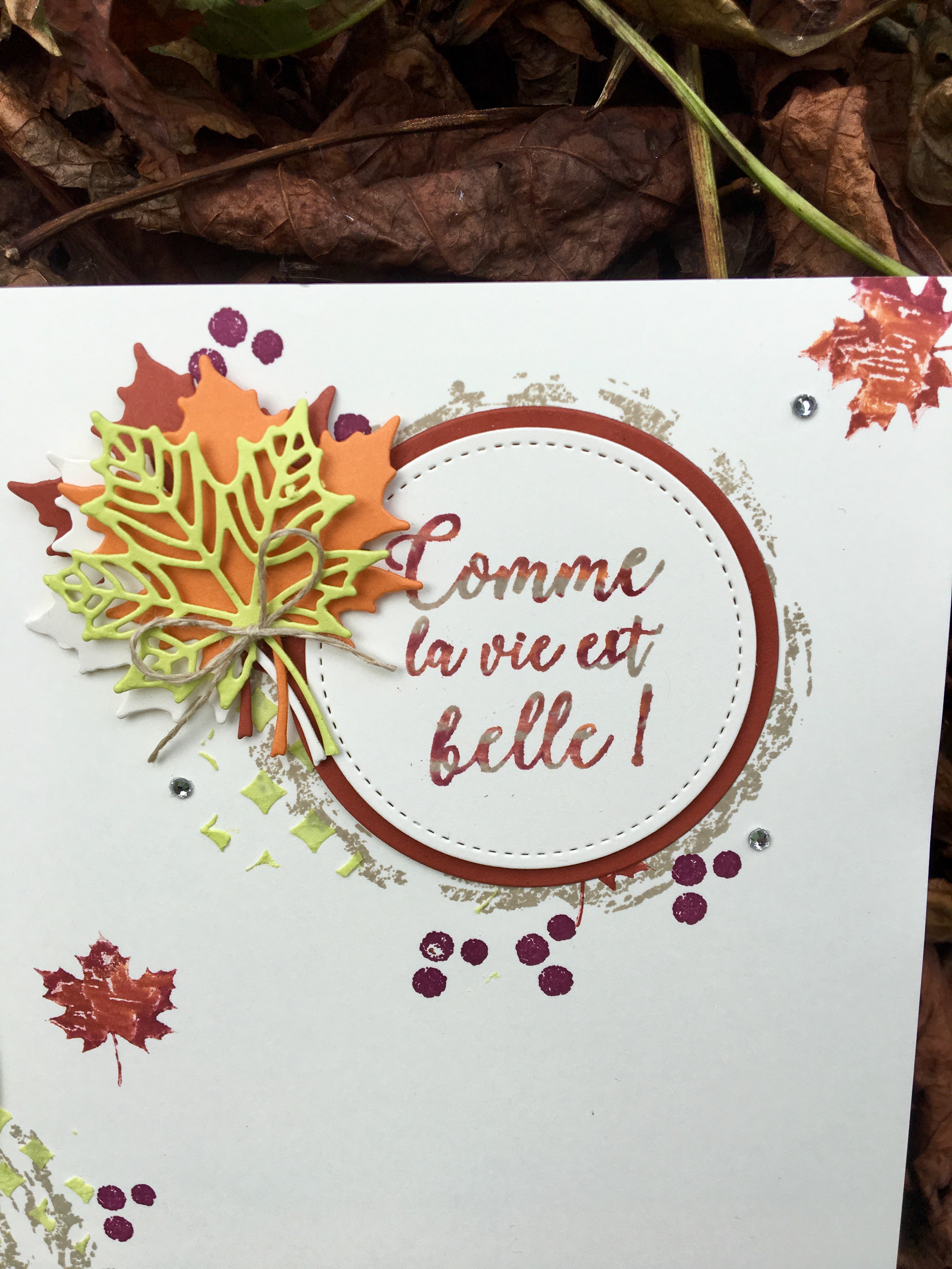 Les marqueurs Stampin White m’ont servi pour faire les feuilles, ça donne un beau mélange qui reflète bien la réalité je trouve…