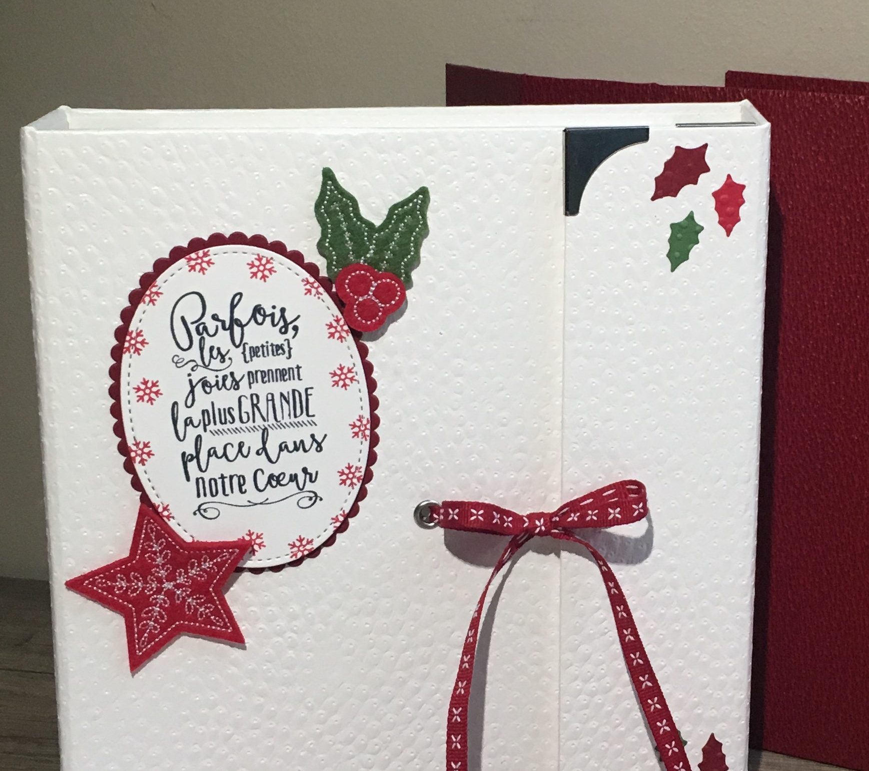 Vous aurez la possibilité de choisir une couverture blanche ou une couverture rouge au moment de votre inscription. À l’intérieur de nombreuses surprises vous attendent. Nous avons travaillé les collections de papier « Soyons joyeux » et « Noël matelassé ».