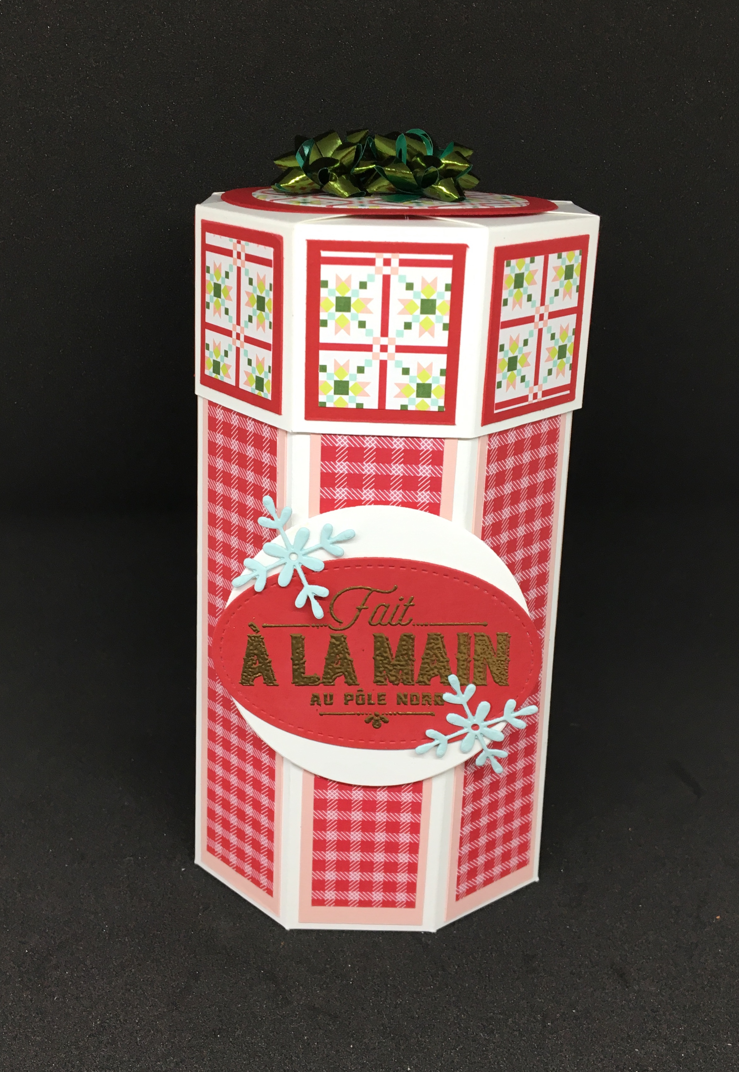 Au départ, j’étais partie pour faire une lanterne de Noël, mais il était tard et je n’avais pas les yeux en face des trous donc ma feuille est partie à la poubelle et moi j’ai suivi mon instinct et voila que je me retrouve avec une boîte Octogonale et un peu d’embossage à chaud hihiii