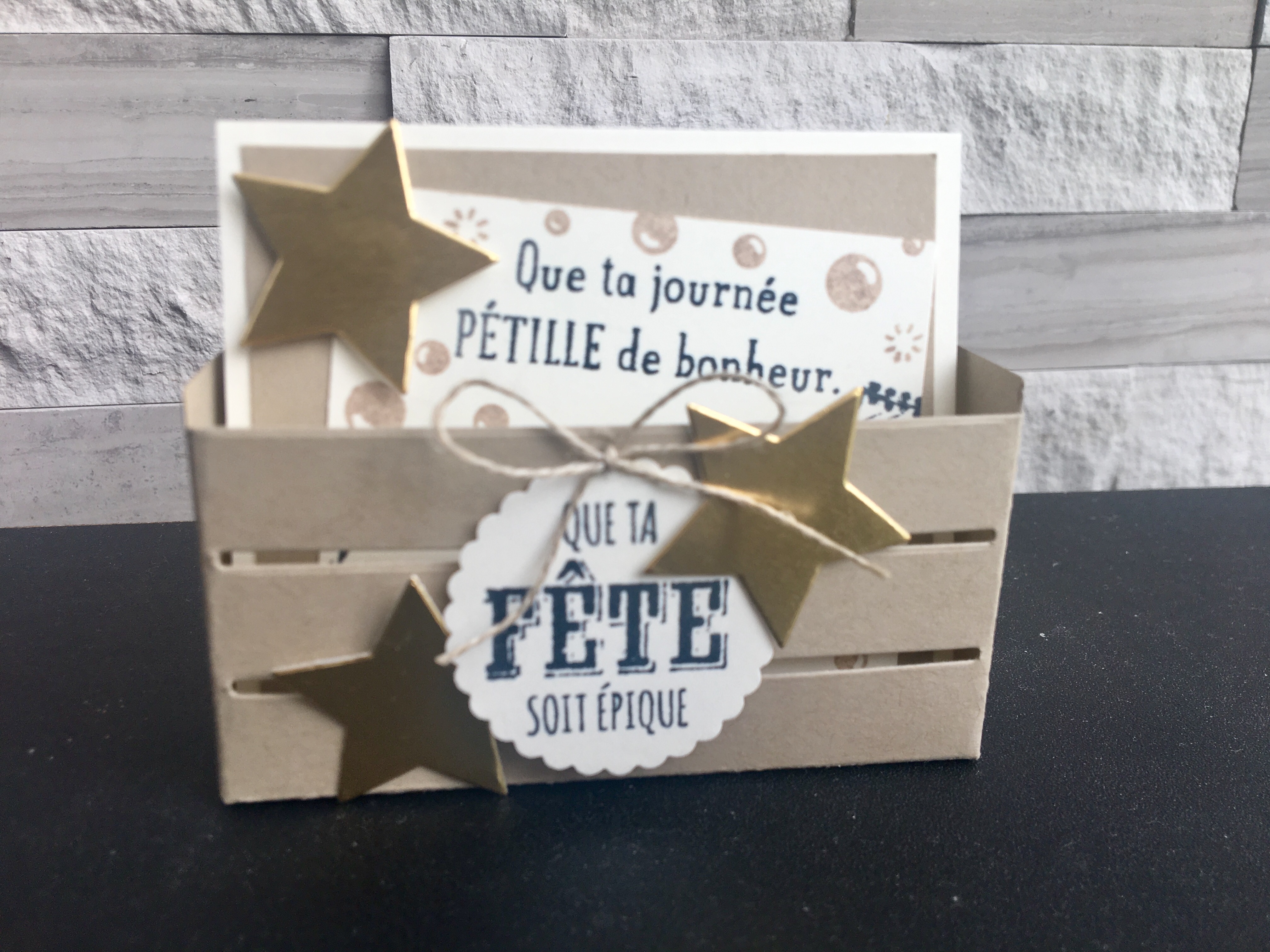 J’ai notamment utilisé le set de tampons que l’on peut obtenir gratuitement jusqu’au 31 mars (alors hop hop hop!!) ainsi que le die « Caisse en Bois » qui est juste super sympa