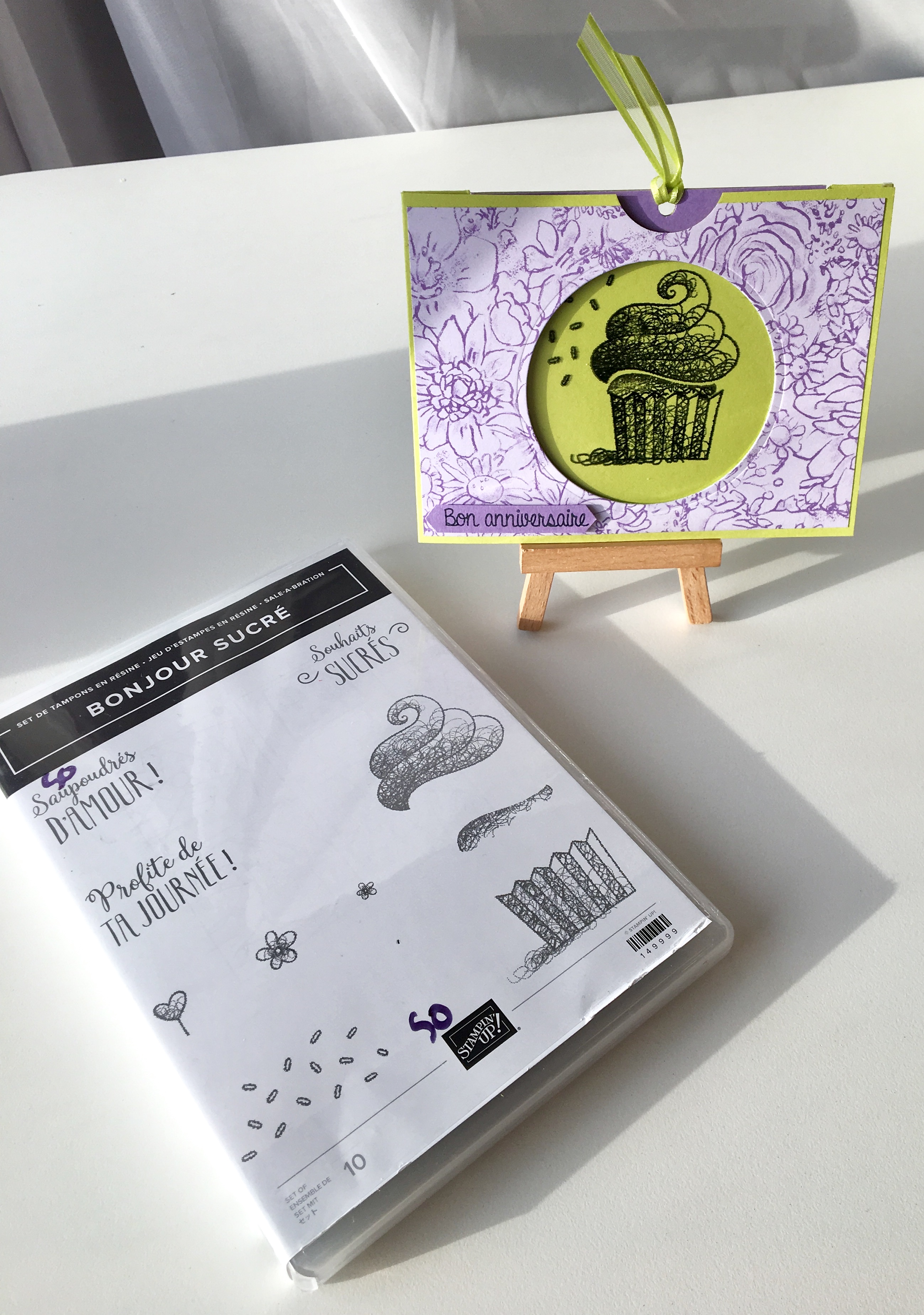 Je vous montre aujourd’hui, une petite cartounette magique que j’ai réalisée avec le set de tampons « Bonjour Sucré » Et le papier design « Papillon Botanique » qui offrent multitude de possibilités