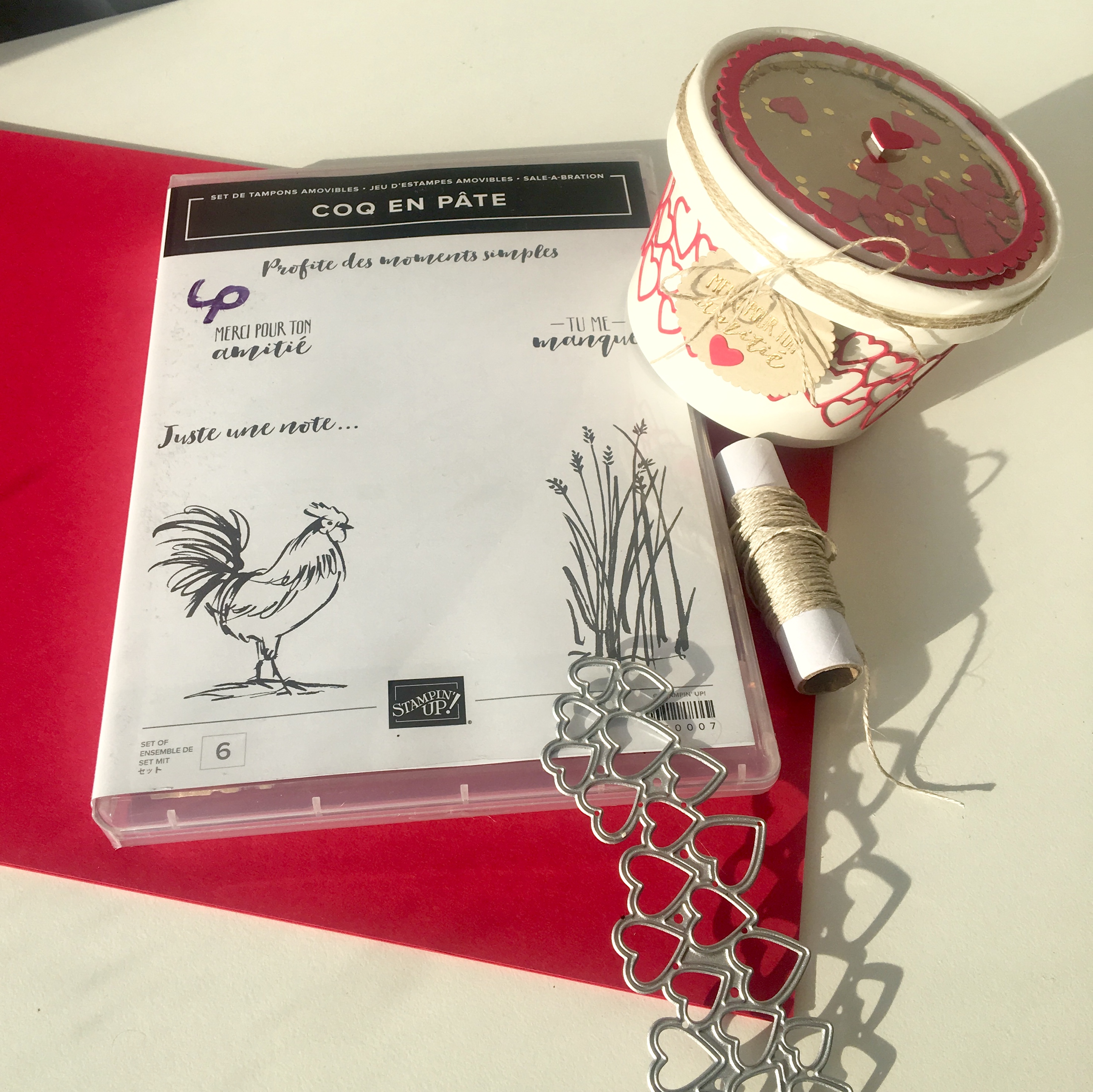 L’idée quand je reçois un set de tampons, c’est de réussir à l’utiliser pour une multitudes d’usages. Surtout quand le set en question ne vous inspire pas des masses. C’était le cas pour « Coq en pate » (set à gagner pendant la SAB) mais regardez le attentivement et ses petits sentiments ils sont pas trop choupi? leur police d’écriture heinnnn??? du coup hop, un peu d’embossage a chaud, du papier « Levre Vermeille », un shaker couvercle et notre gobelet est devenu un gobelet romantique prêt à recevoir un Pandora ou un collier, ou même des chocolats (Je suis pas difficile moi LOL)