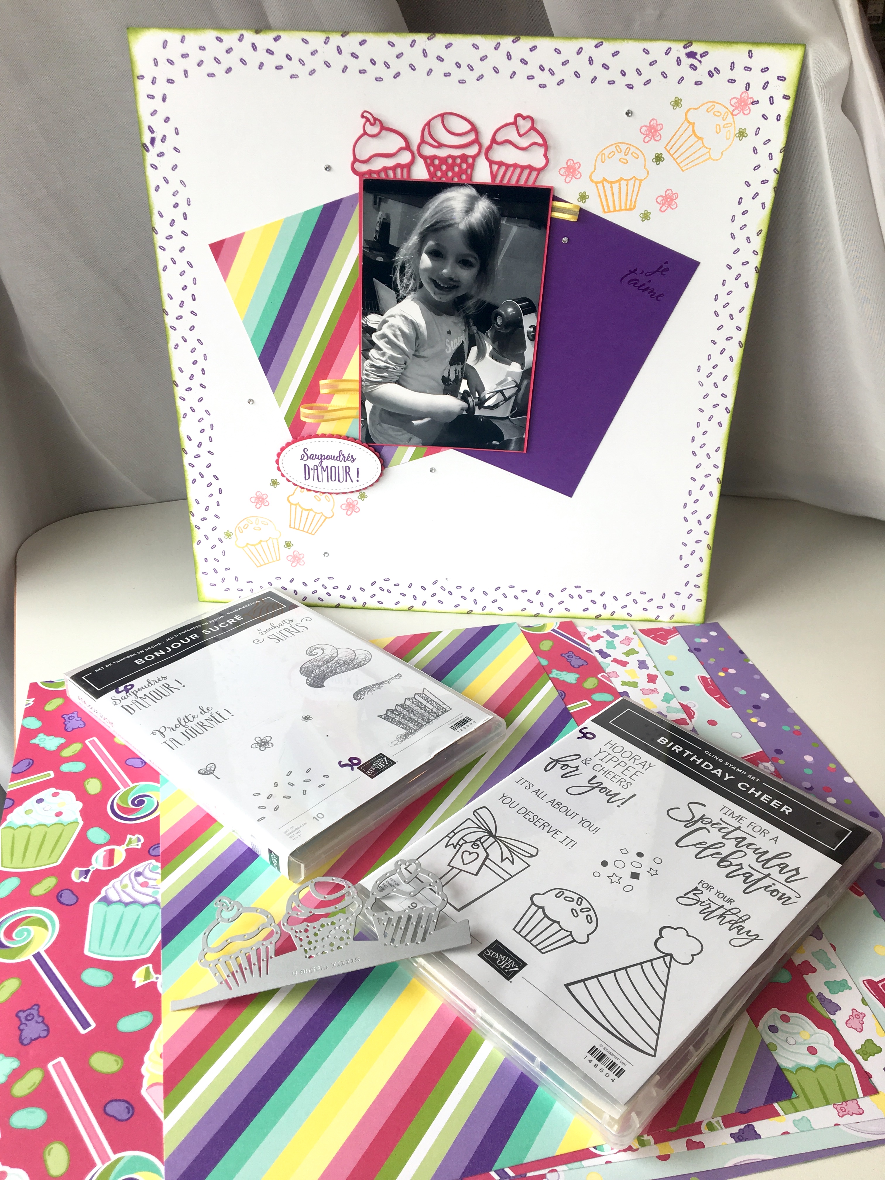 Pour réaliser mon fond de page, j’ai utilisé les vermicelles et autres deco du set « Bonjour Sucré » (ce set on peut la choisir en cadeau par tranche de 60€ et ce jusqu’à épuisement des stocks)