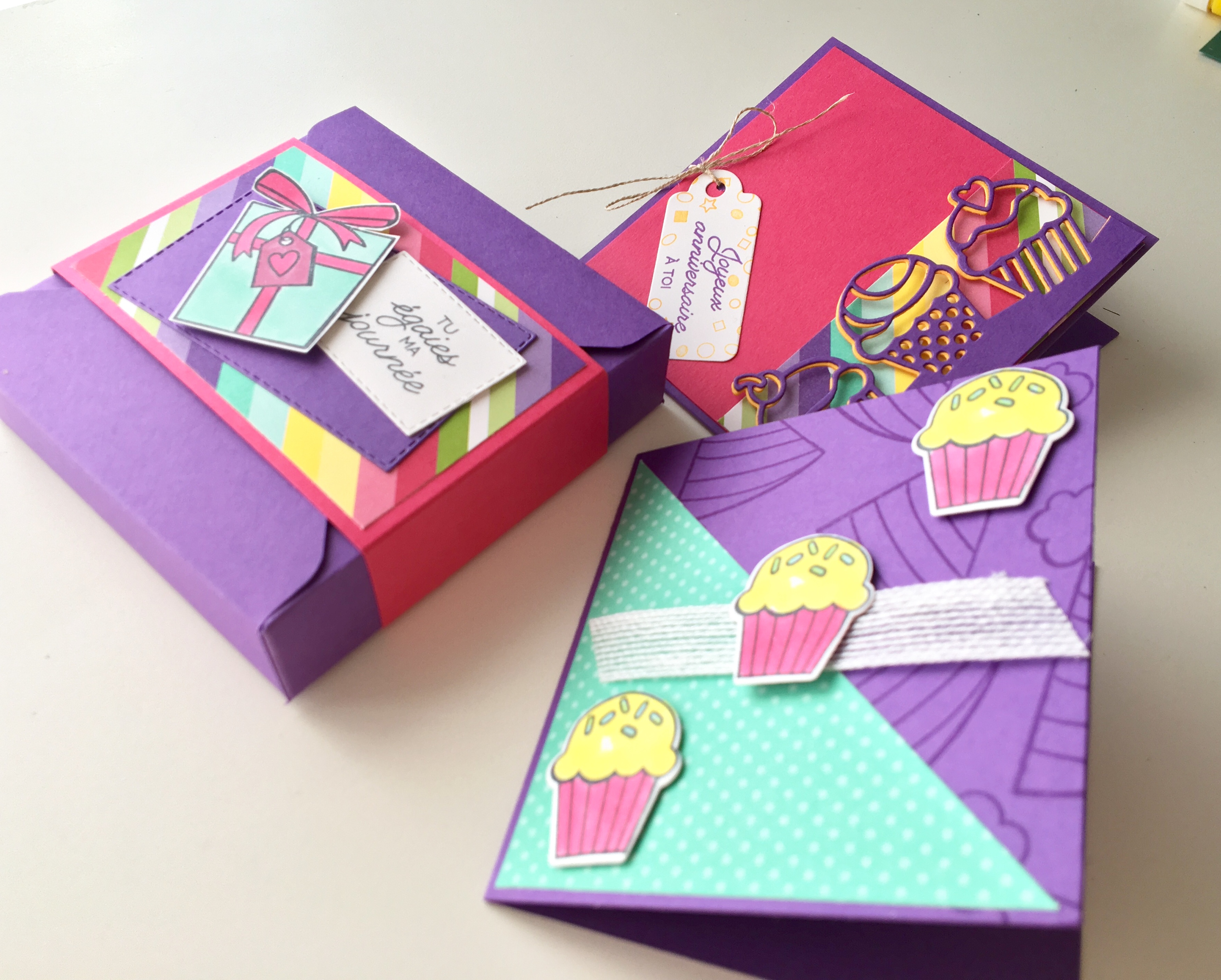Donc on a dit découverte du scrap: avec réalisation d’une boîte, réalisation de deux cartes à mettre dedans avec différents tamponnages, utilisation de la big shot avec des dies coordonnées, utilisation de rubans, ficelles et Stampin blends (feutres à l’alcool)