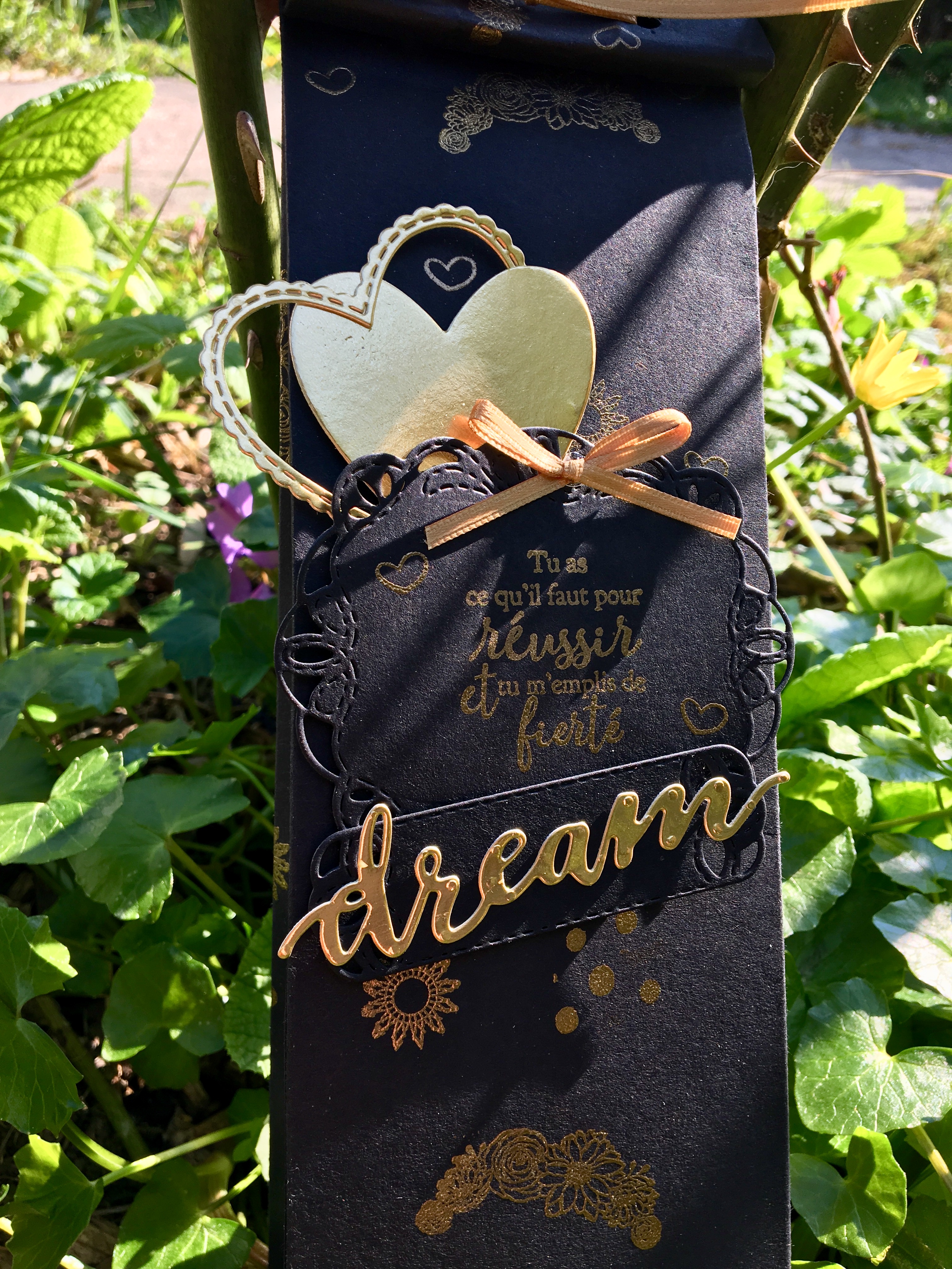 Donc je lui ai offert une paire de ciseaux Or pour marquer le coup. Pour le lui offrir, j’ai réalisé une pochette à l’insta-pochette et comme pour mes swaps, j’ai fais mon propre papier mais là à l’aide de poudre à embosser et de mon pistolet chauffant. Des coeurs, et la découpe « Dreams » car c’est comme dans un rêve et hop quelques larmes plus tard, tout le monde était ravi hihiii
