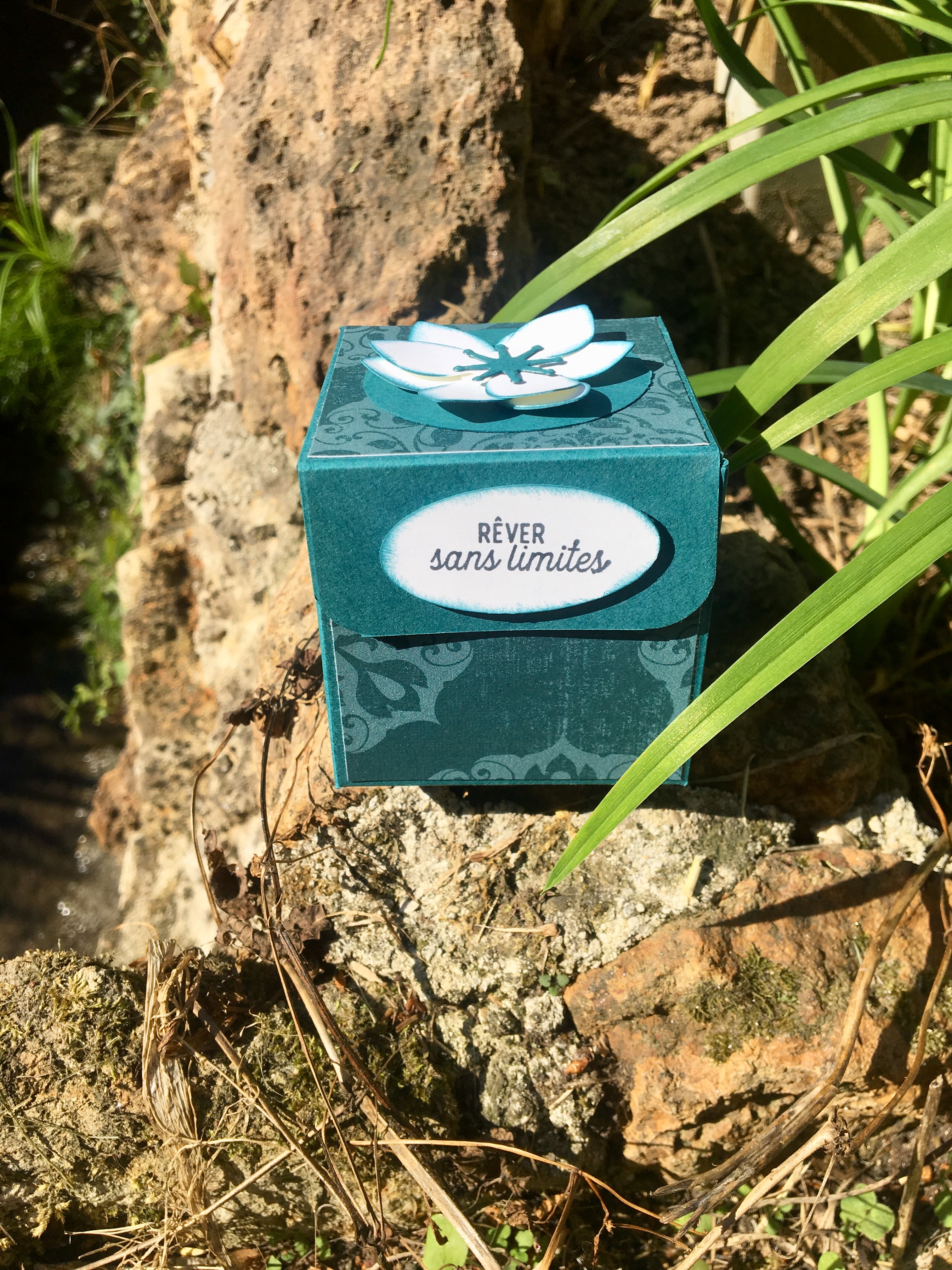 Petite boîte qui se ferme avec un aimant, une fleur pour le rappel de la boîte que les participantes ont eu à réalisées