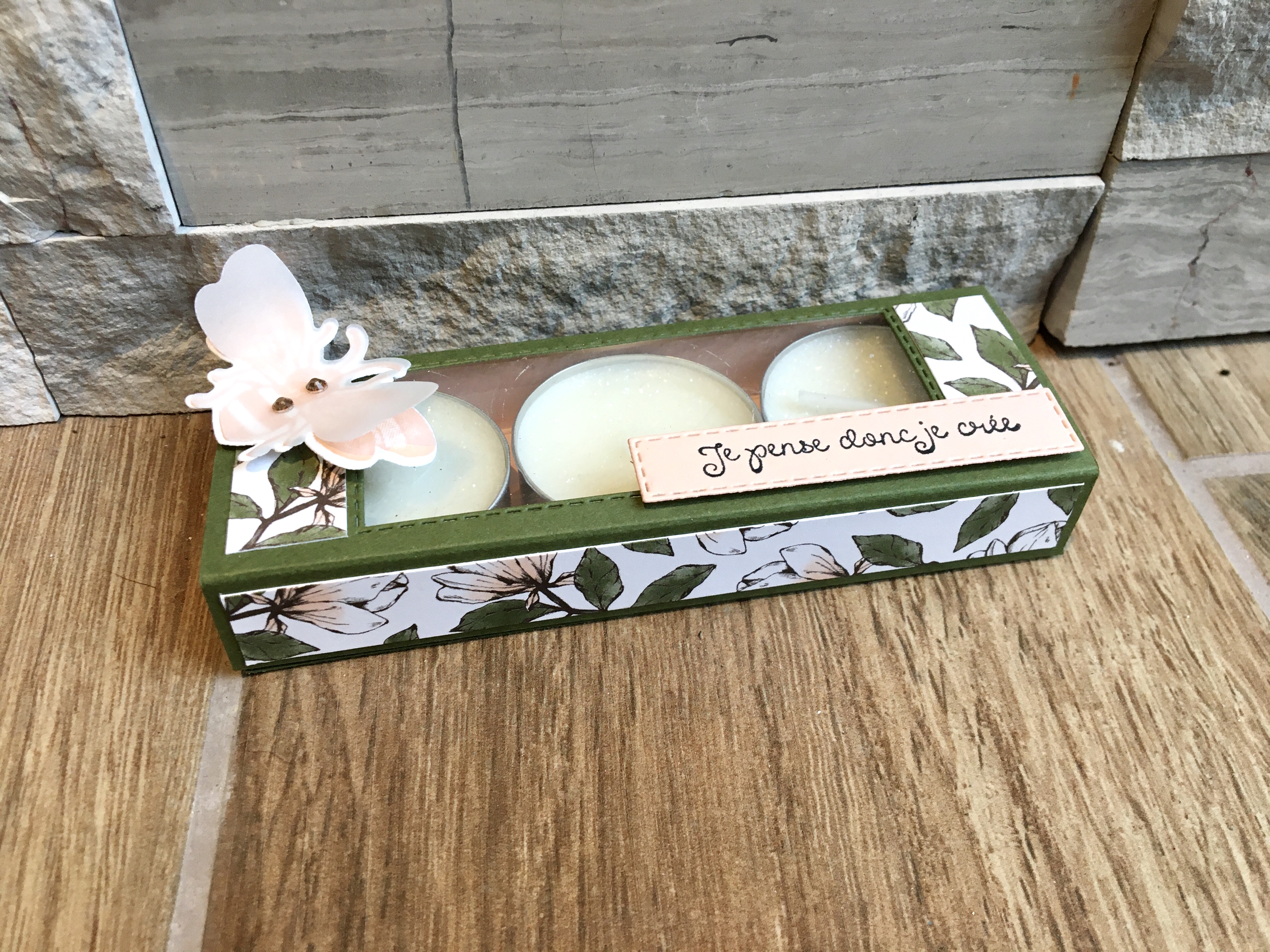 Vous le savez, j’aime le principe des boîtes allumettes, pour celle ci j’en ai fait une aux dimensions de 3 bougies chauffe plat (qui ont des paillettes!) et à l’aide d’un des rectangles surpiqués j’ai créé une ouverture. J’ai utilisé du papier fenêtré que j’ai collé en dessous