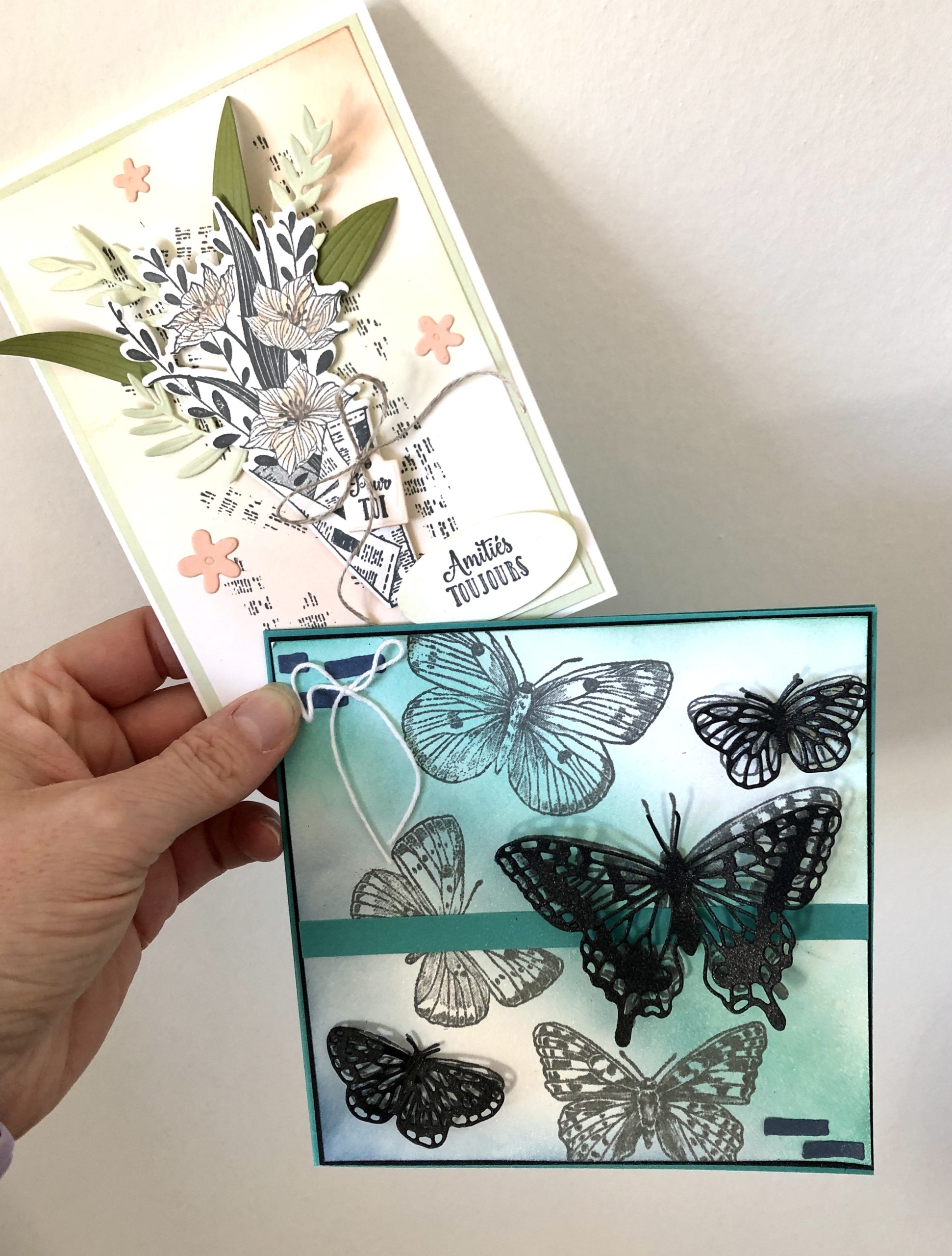 L’une avec le lot « Bouquet de souhaits » dans les tons pastels et l’autre avec la superbe collection « Bouquet de papillons » qui est en pré commande à partir d’aujourd’hui. Cette deuxième carte est dans des tons bleus et noir soit à l’opposé de la première avec un résultat tout aussi sympa, vous verrez