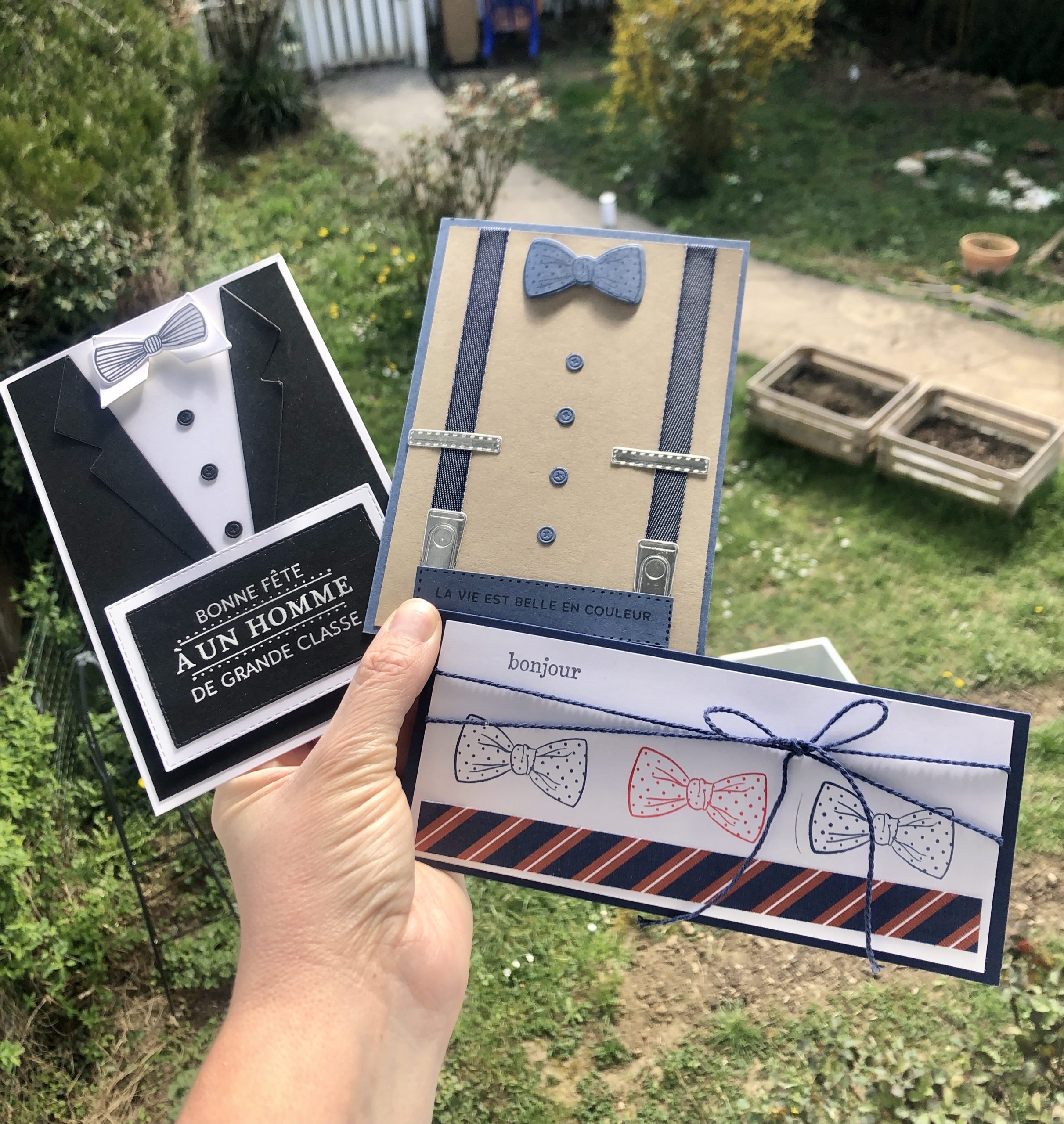 Pour ce faire, je vous montre 3 modèles de cartes réaliser avec le lot « Bien Cravaté » de chez Stampin Up