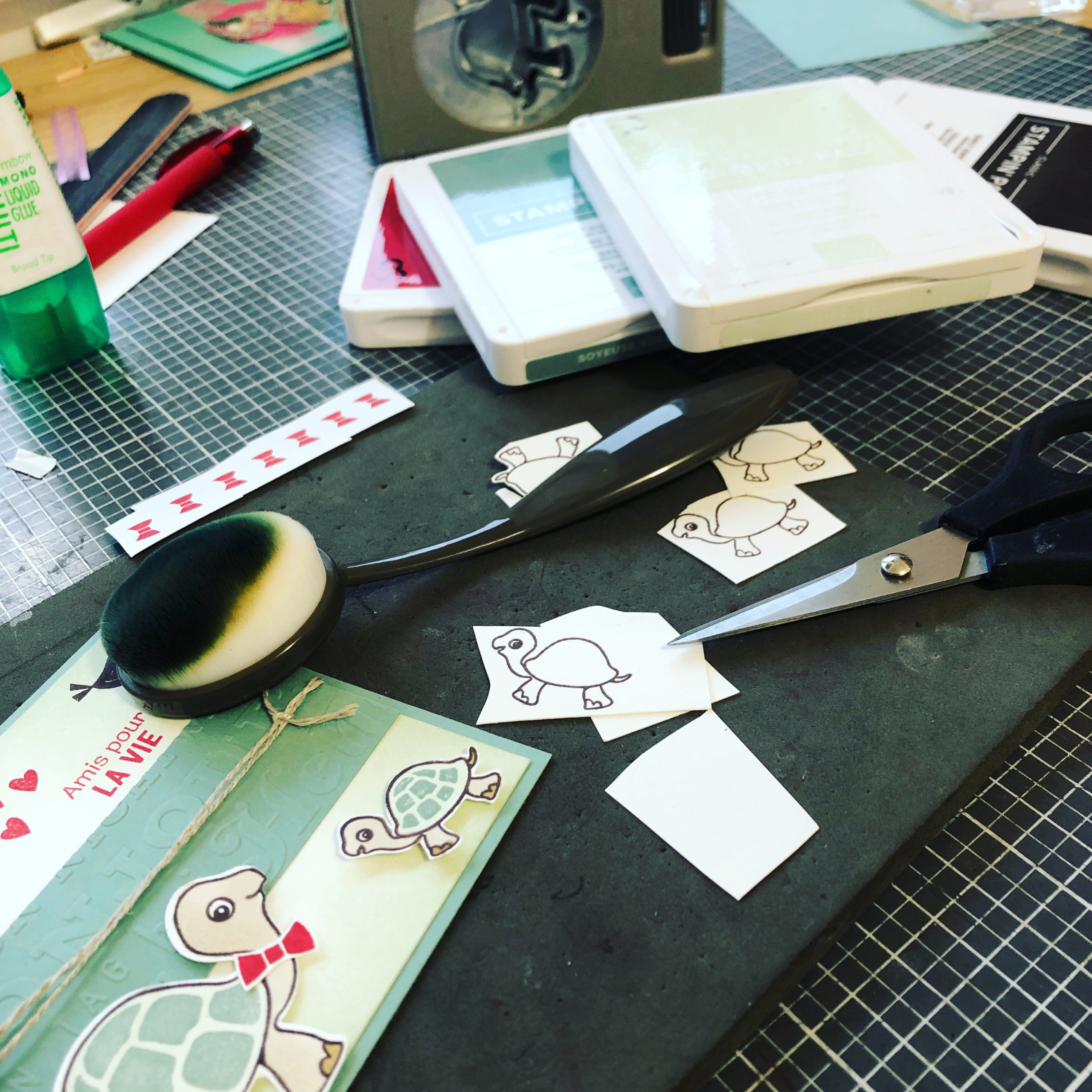 A la découverte des encres liquides avec la carte violette (Fressia en fleur) et le magnifique lot « Quiétude Champêtre » et l’autre verte « Soyeuse succulente » et le trop rigolo lot « Nos amies tortues »