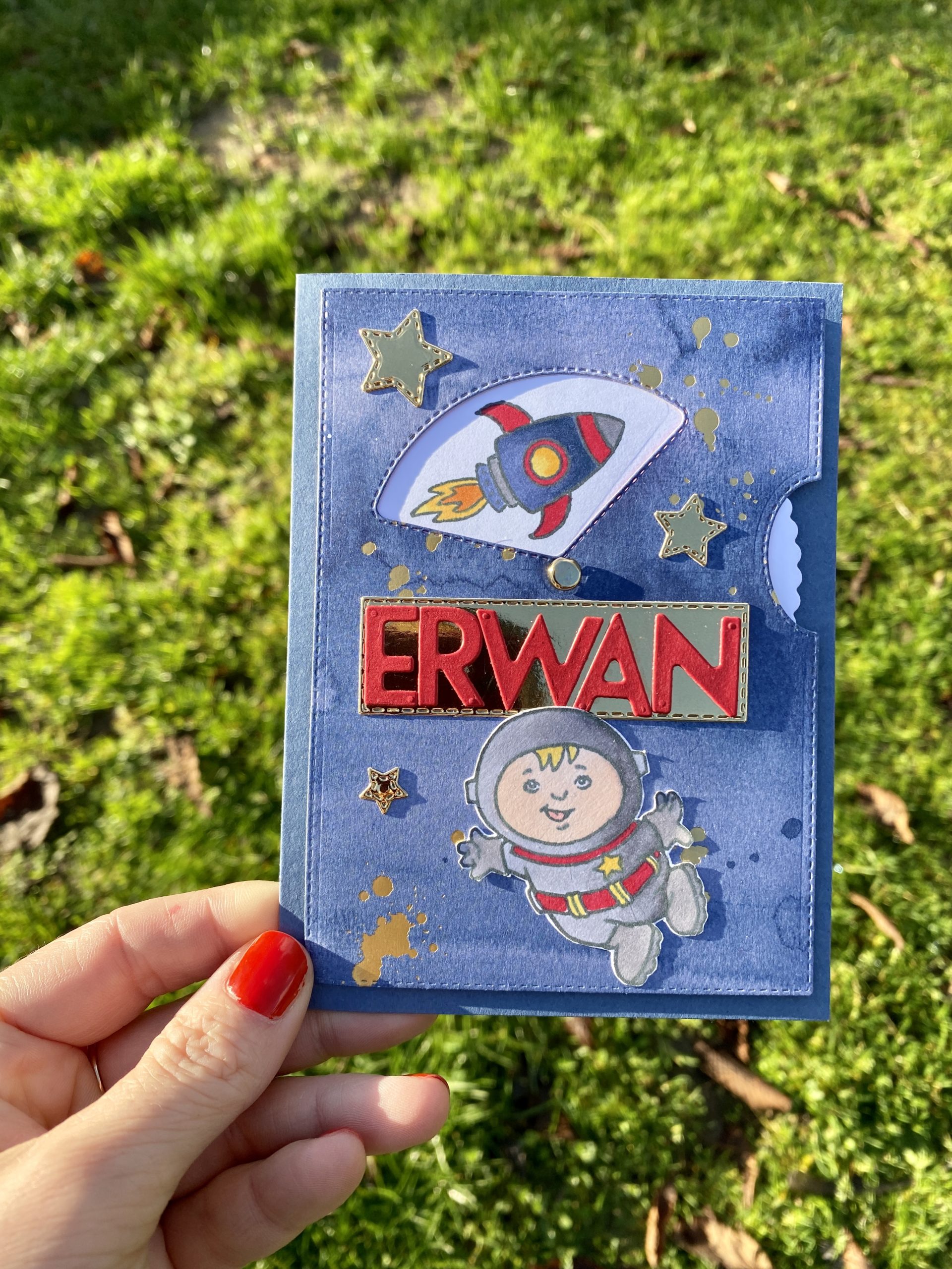J’ai détouré le ptit cosmonaute et à l’aide des poinçons Alphabets à loisirs j’ai pu écrire son prénom