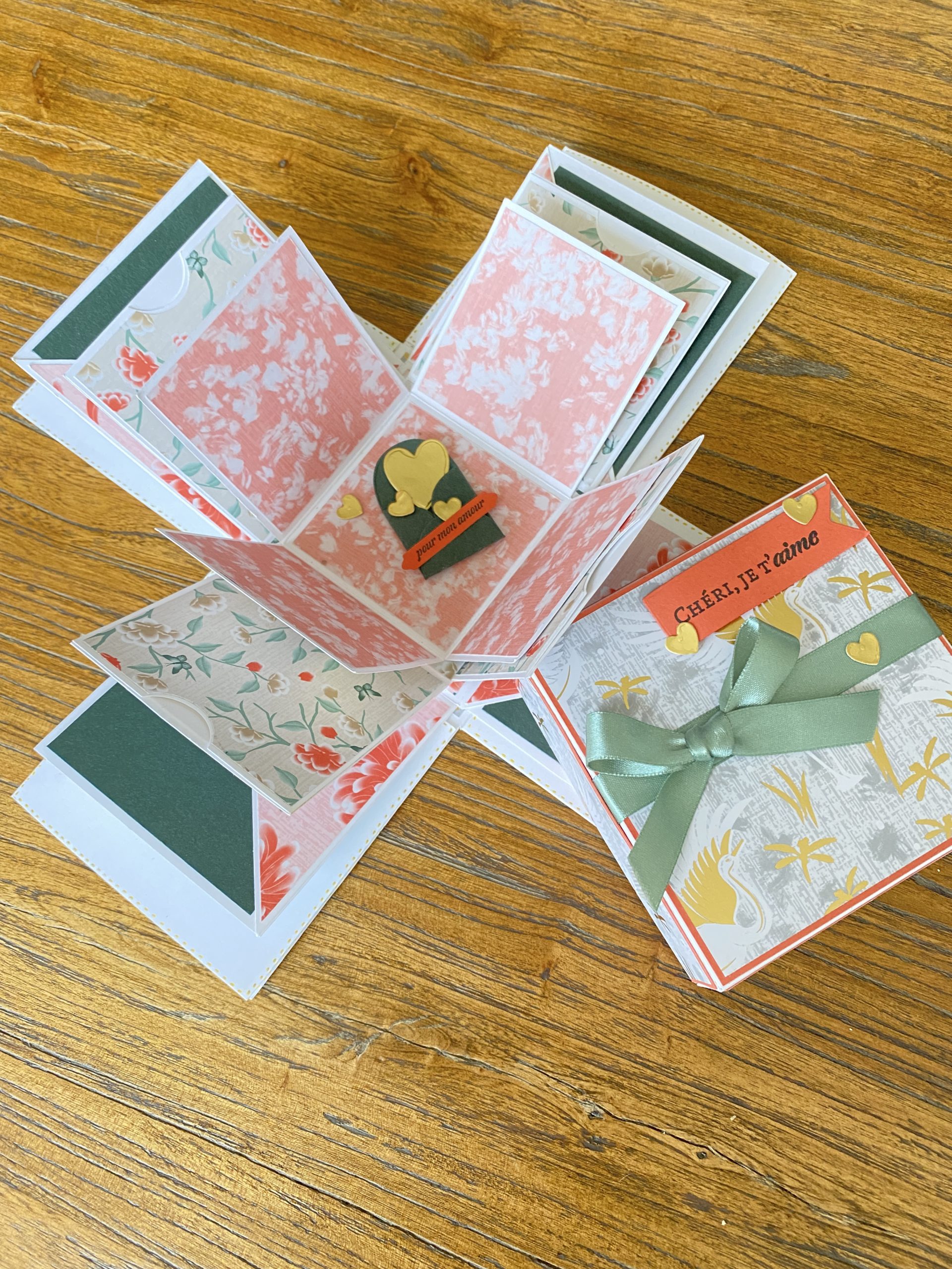 Je vous montre aujourd’hui la superbe boîte à explosion que Steph nous a proposée de réaliser en atelier à l’association Enjoy Scrap (La Houssaye 77)