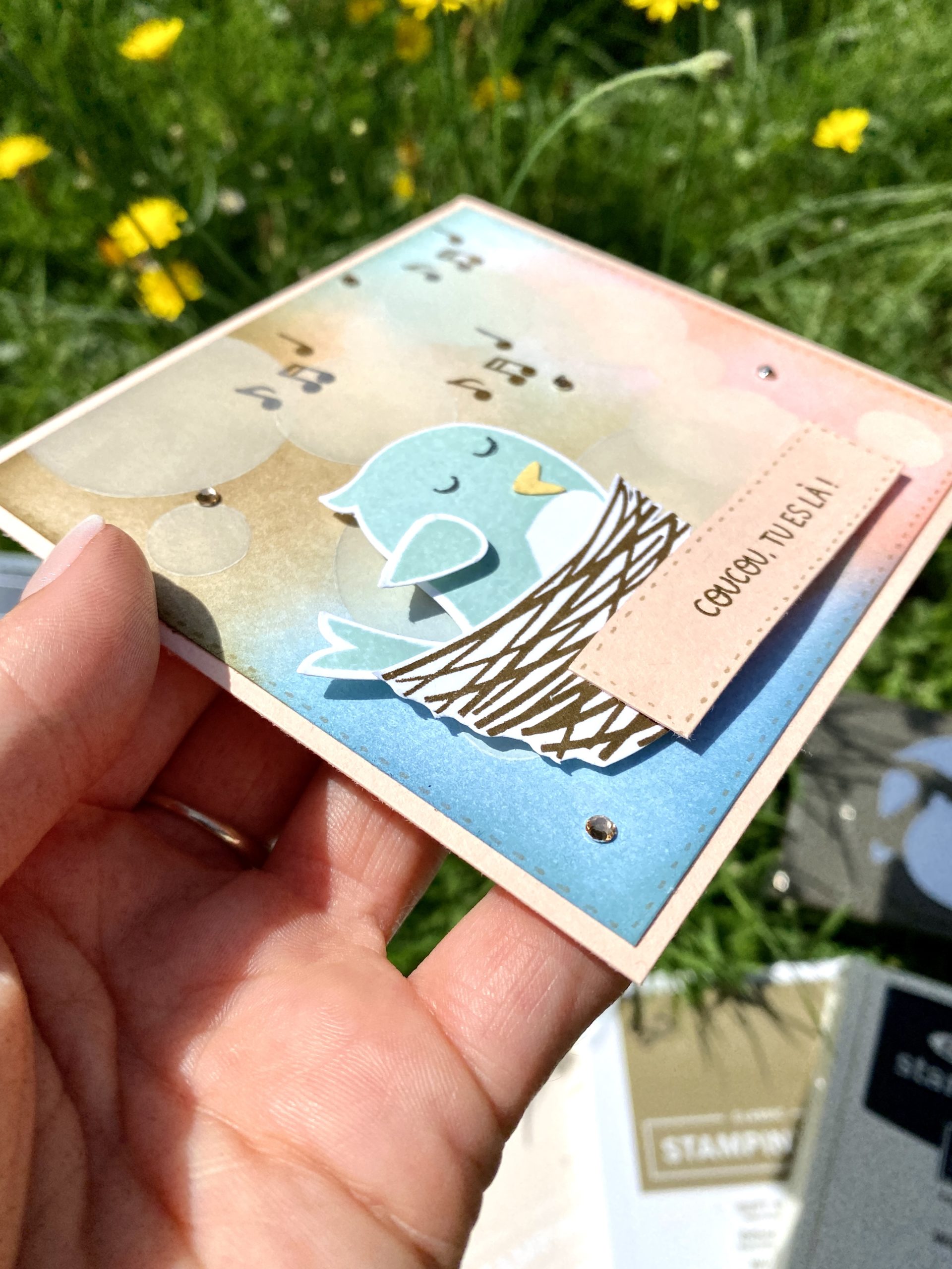 Une petite carte faite avec amour, des douce couleurs subtil et un pioupiou qui chante