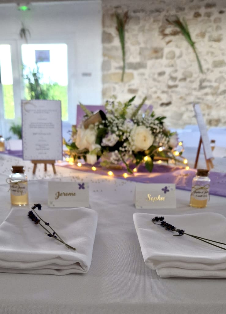 Voici un exemple de table, avec un brin de lavande pour faire un clin d’oeil a la famille venant du sud ( je remercie d’ailleurs les filles qui se sont démenées pour la trouvée cette lavande!)