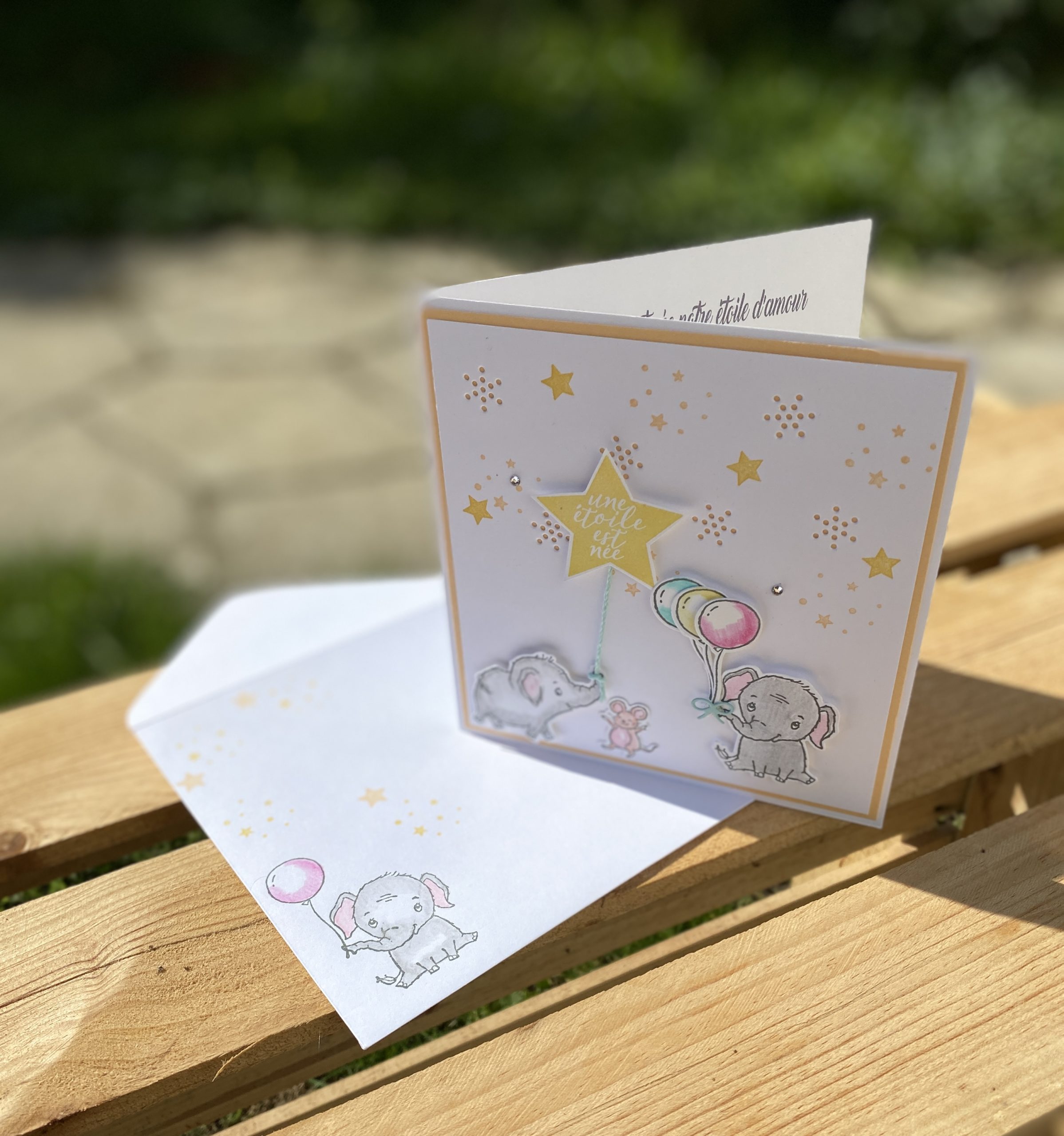 J’ai utilisé le set de tampons et les poinçons de découpes coordonnées « Elephant Parade » P 48 du catalogue annuel Stampin’Up!