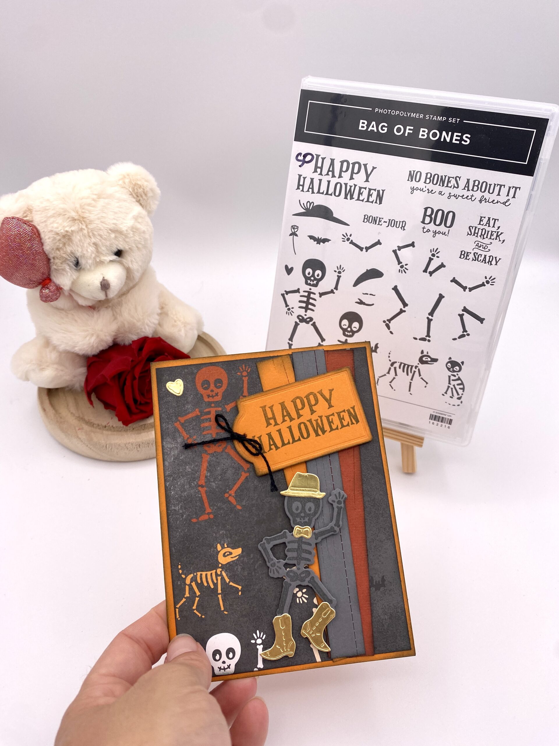 Moi j’aime faire des cartes rigolotes et sympathiques et avec la collection « Bag of Bones » je crois que je suis servi