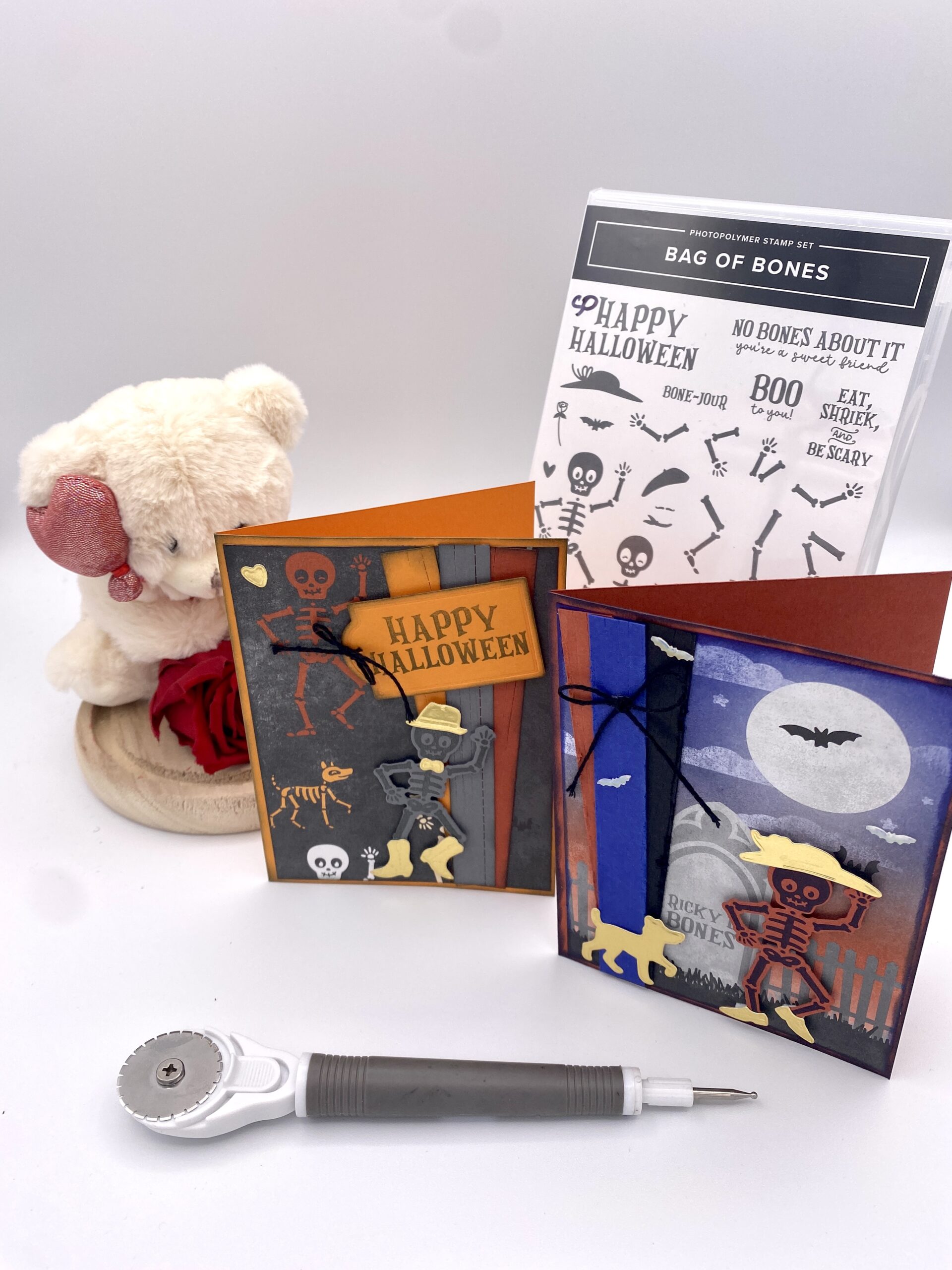 Lors de ce moment créatif, nous avons découvert la série de papiers design « Os courts » et le lot set de tampons « Bag of bones » qui est juste trop bien et offre beaucoup de possibilités