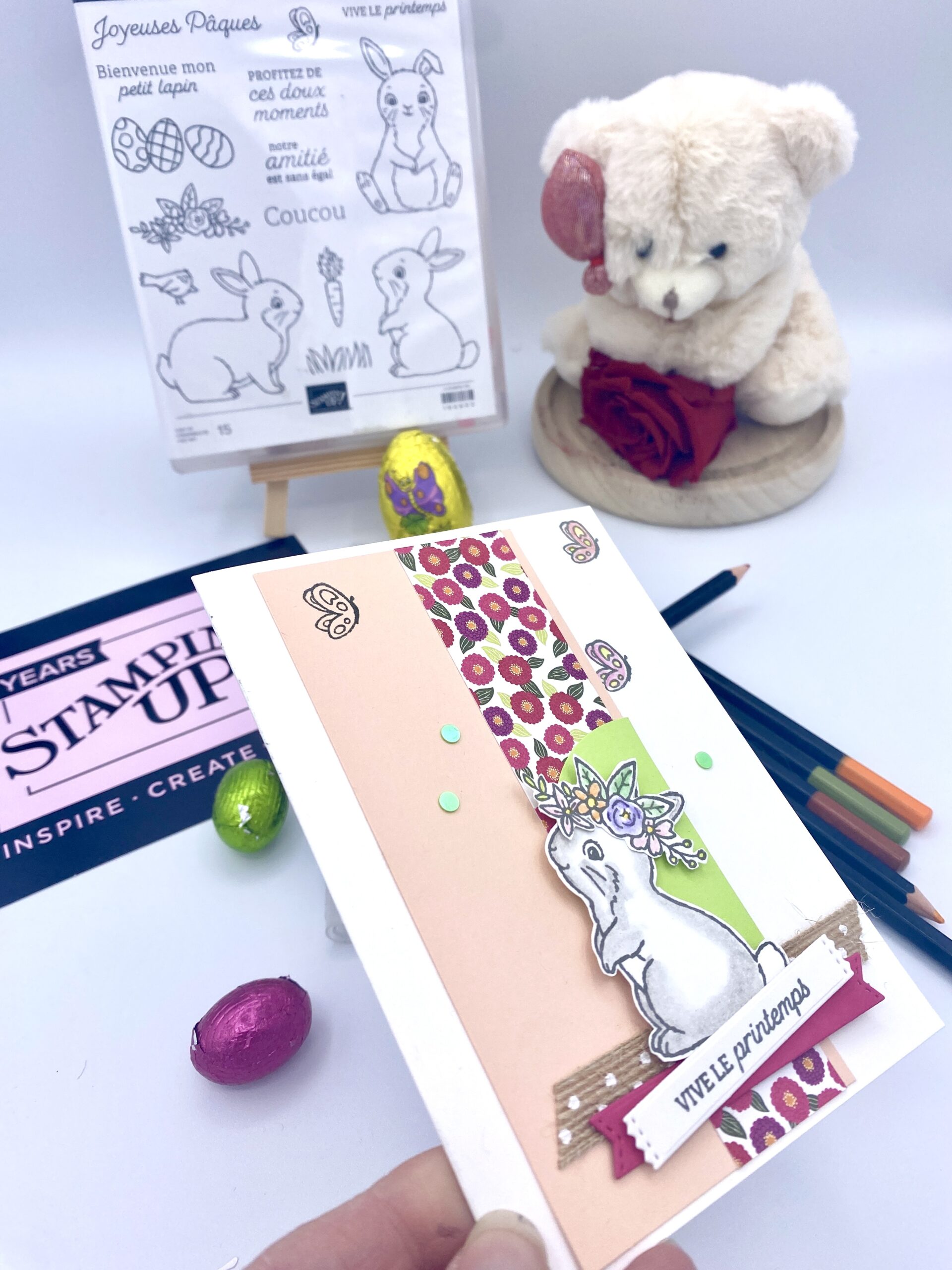 Et oui vous l’avez remarqué, j’ai joué encore avec la collection « Zinnias en fleurs » et forcement le lapin de Pâques