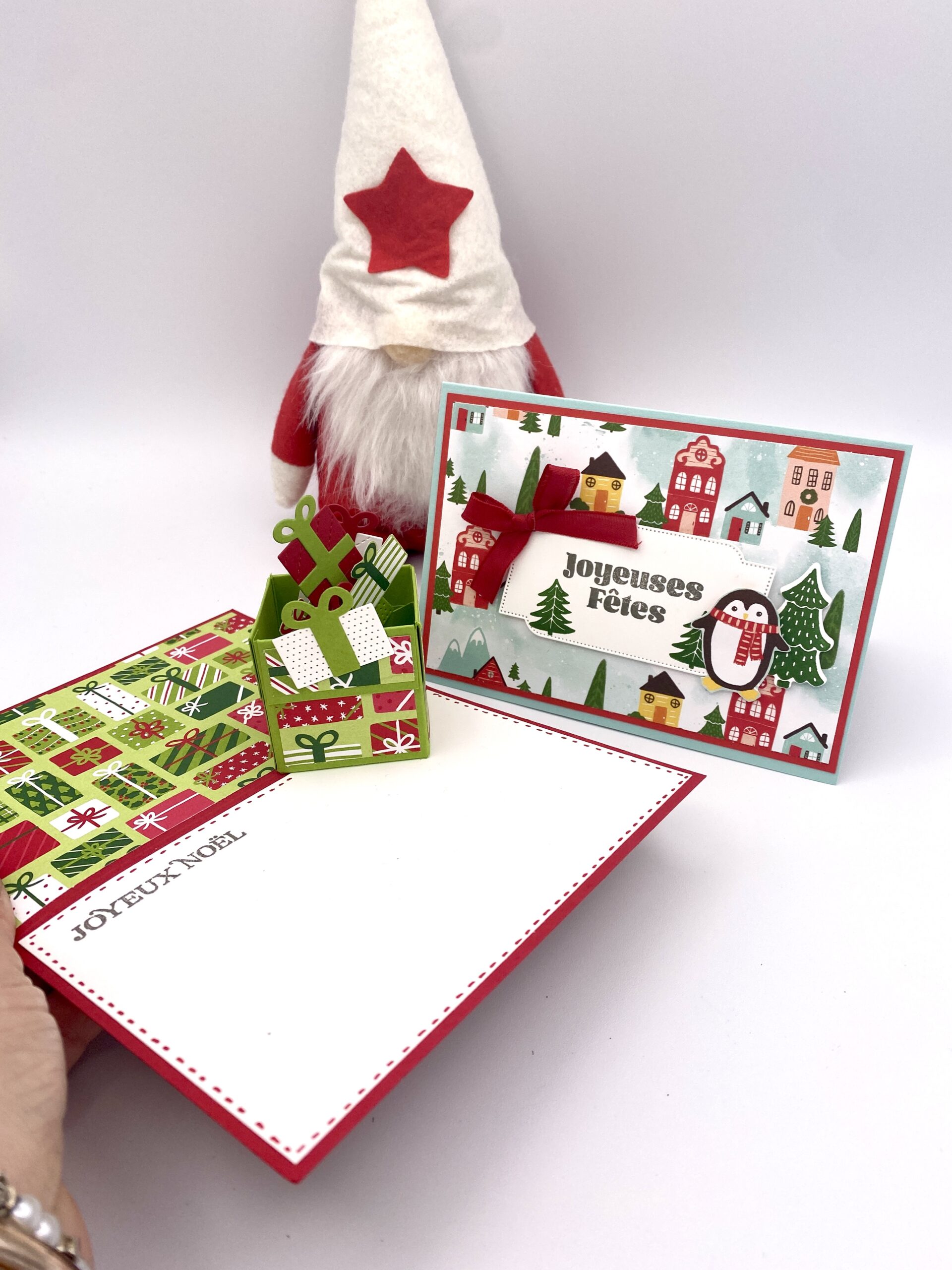 Pour cette carte, je me suis servi de la collection de papier design « scènes enneigées » ainsi que les set de tampons et les poinçons coordonnées mais comme dit (et fait!) j’ai détouré directement avec mes super ciseaux qui coupent jusqu’à la pointe hihiii