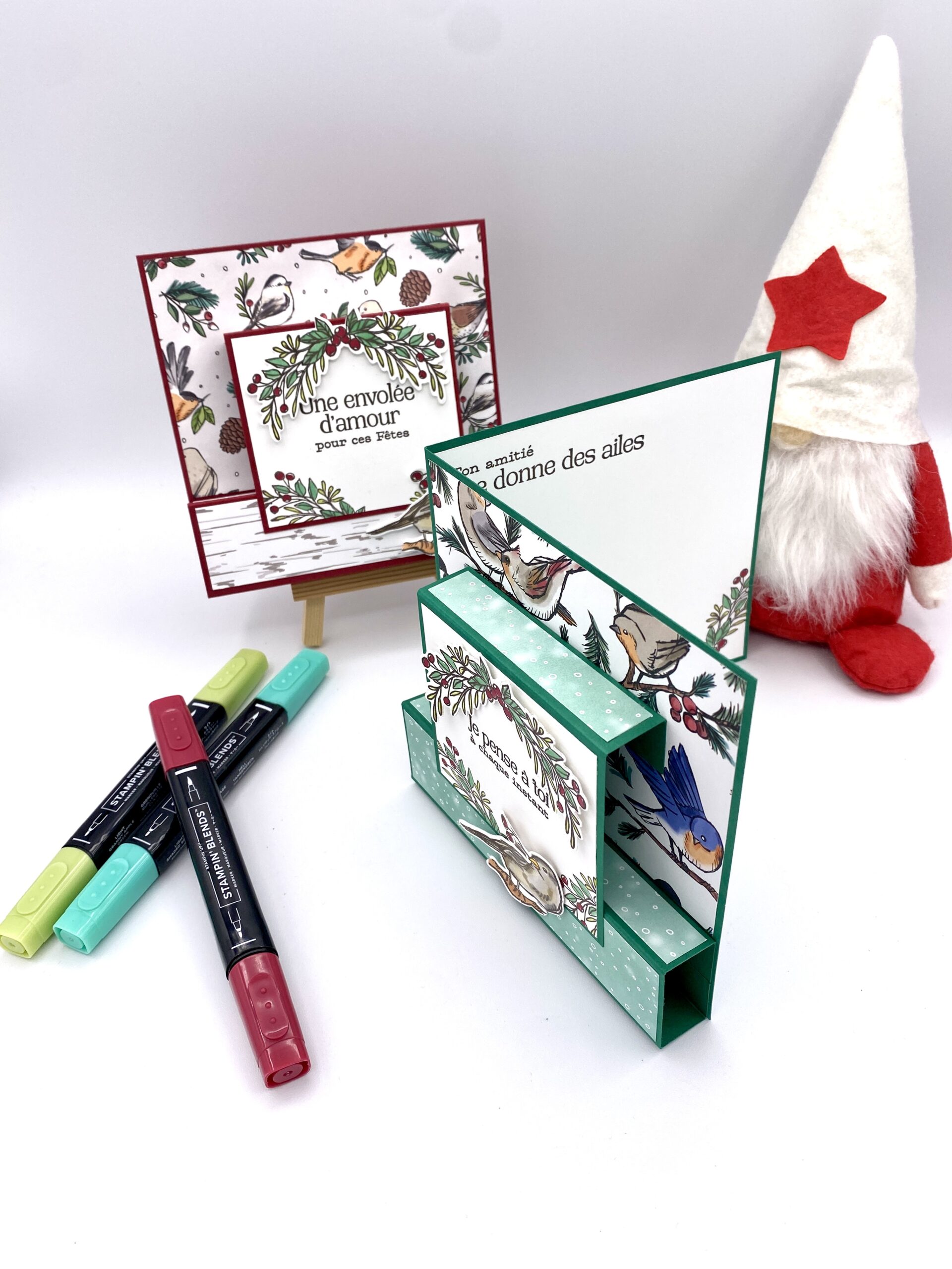 J’ai utilisé la délicieuse collection « Cimes hivernales » de Stampin’Up! avec les feutres à alcool (Stampin Blends) et le papier design assorti Si jamais vous souhaitez vous procurer le même matos que moi qui est de top qualité et coordonné. Y’a pas 36 solutions, non non non. Rdv sur ma boutique en ligne