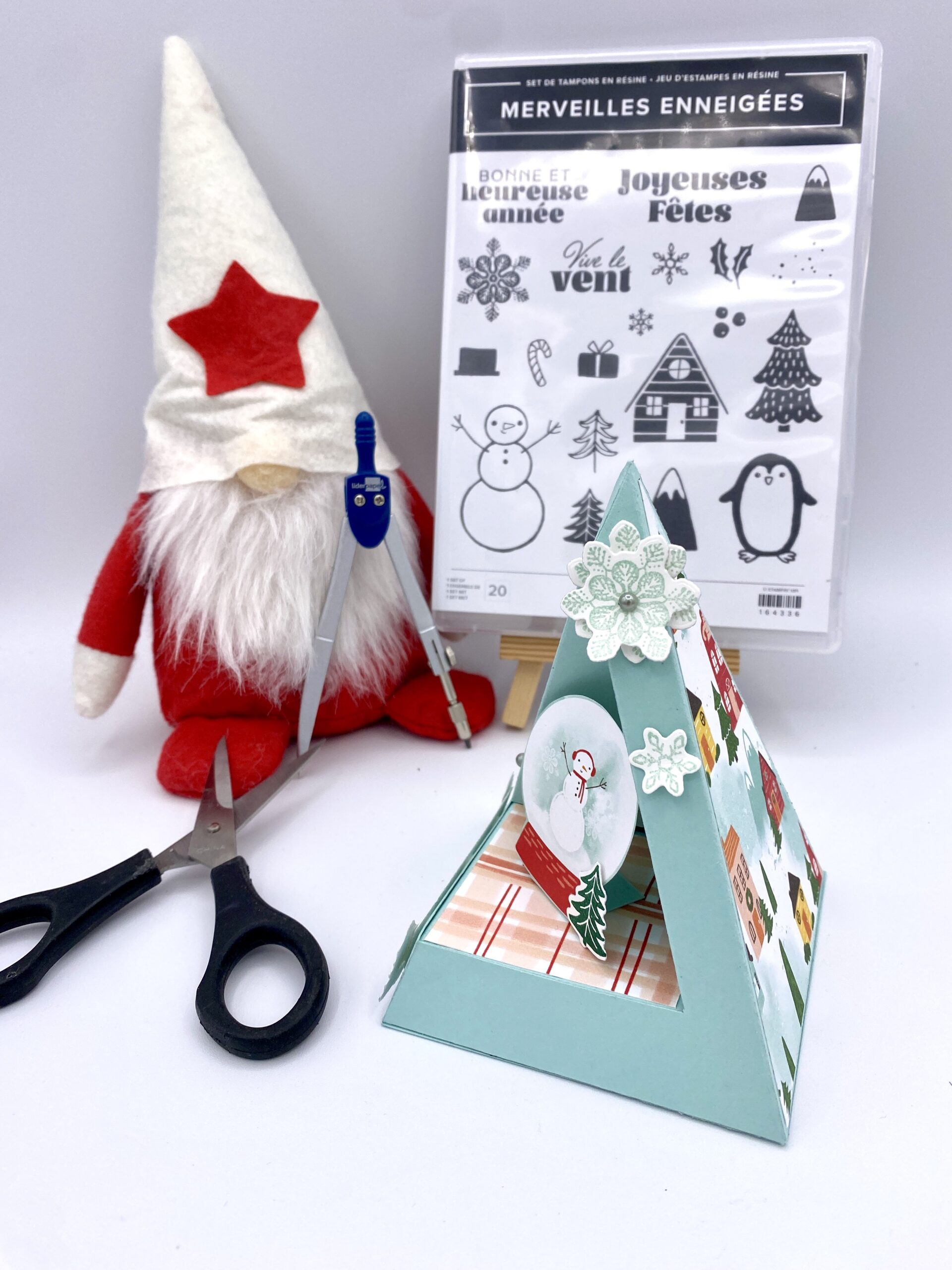 Perso j’ai utilisé la collection « Scène enneigé » et avec mes ciseaux qui coupent jusqu’à la pointe, j’ai détouré directement dans le papier design la boule de neige que je suis venu coincé avec un point de colle et Steph la collection des rennes à profusion et à mis une bougie led au centre