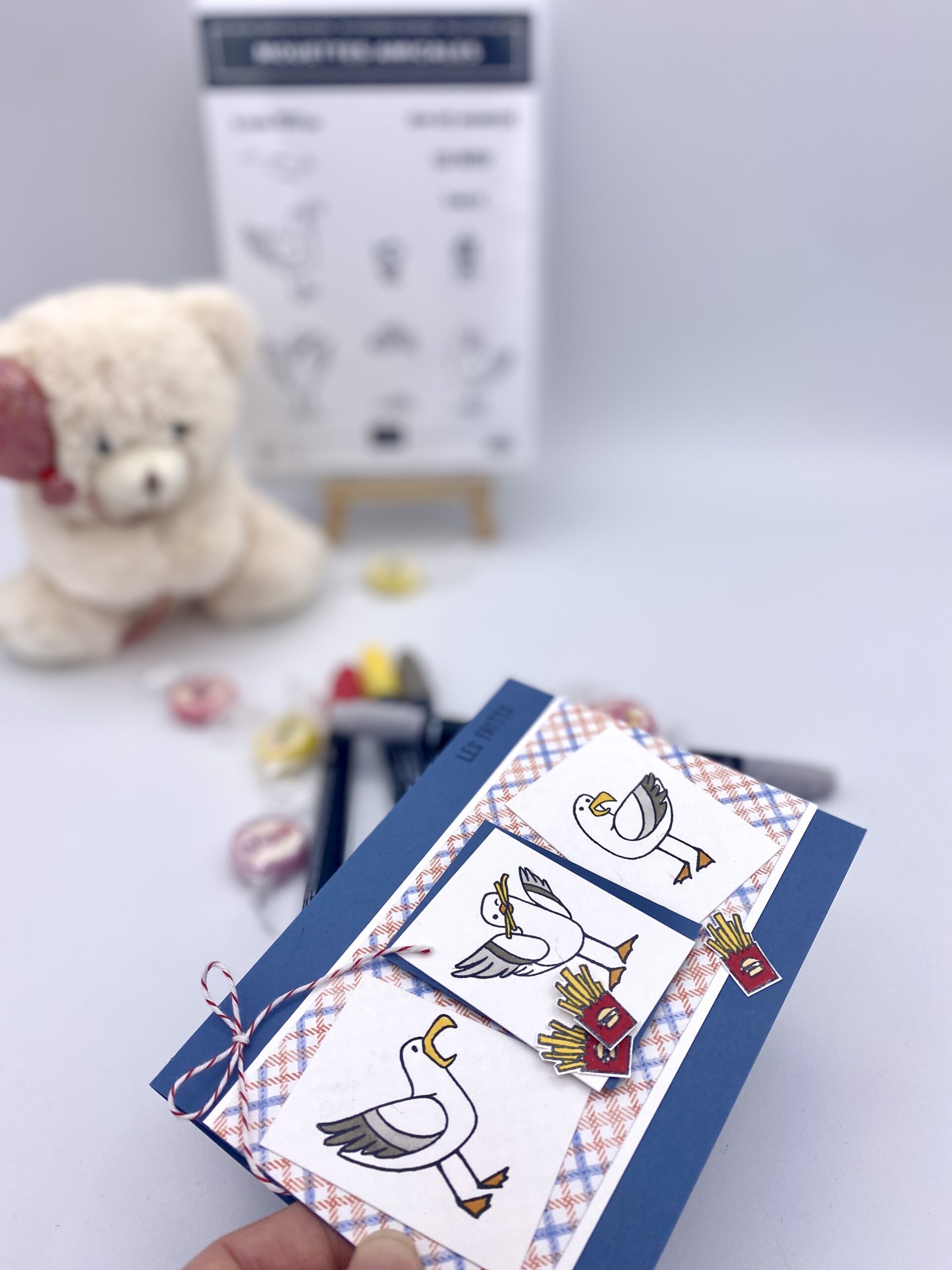 Sur 3 ptit bout de blanc simple, je suis venue tamponné mes 3 différentes mouettes et pour les cornet de frites, je les ai découpé à l’aide de mes supers ciseaux qui coupent jusqu’à la pointe