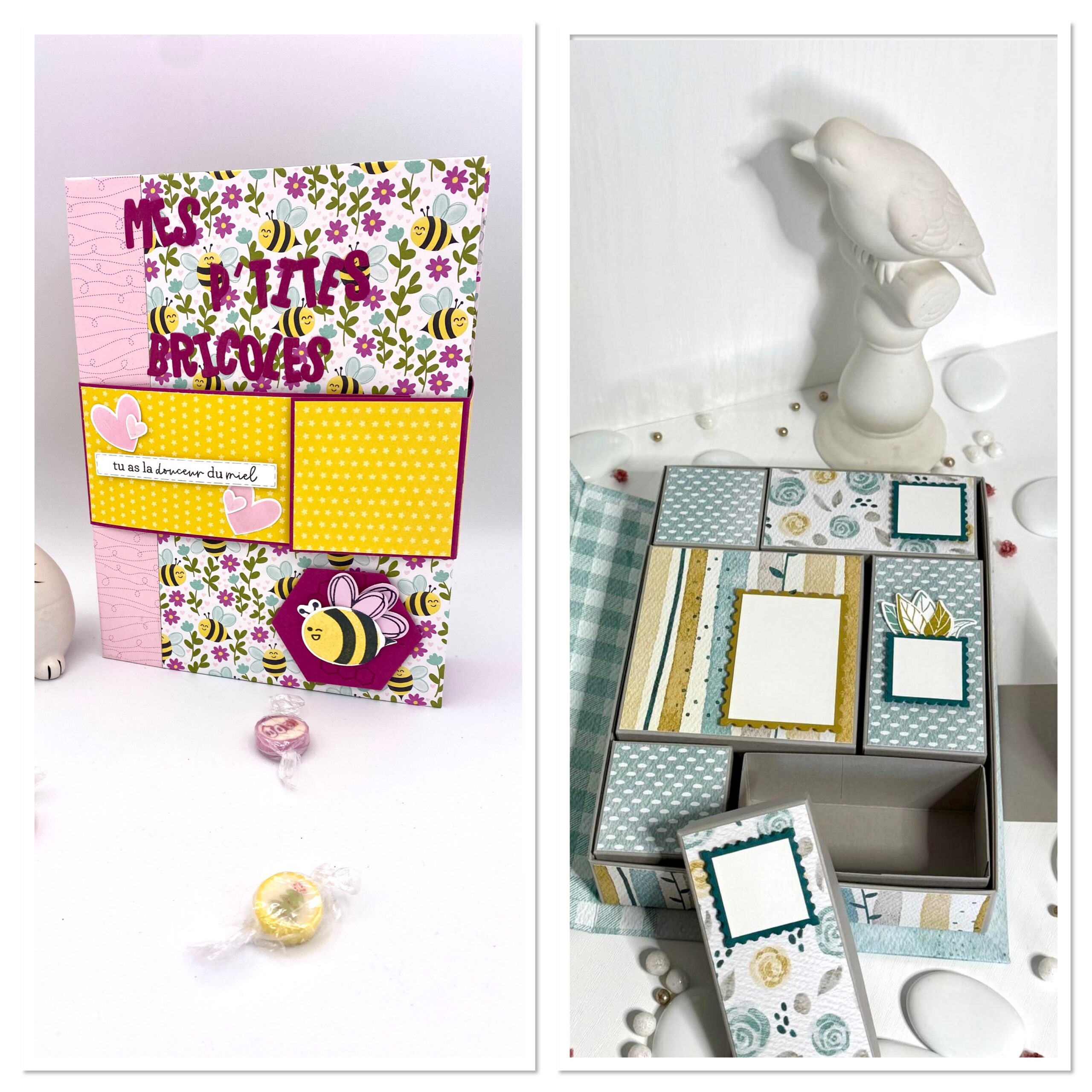 On vous a concocté un kit pour réaliser une création originale et ludique : une boîte de boîtes ! C’est le genre de projet qu’on adore toutes les deux : une structure originale en forme de livre, pleine de petits recoins à décorer, parfaite pour y glisser des douceurs, des messages ou des petits trésors.