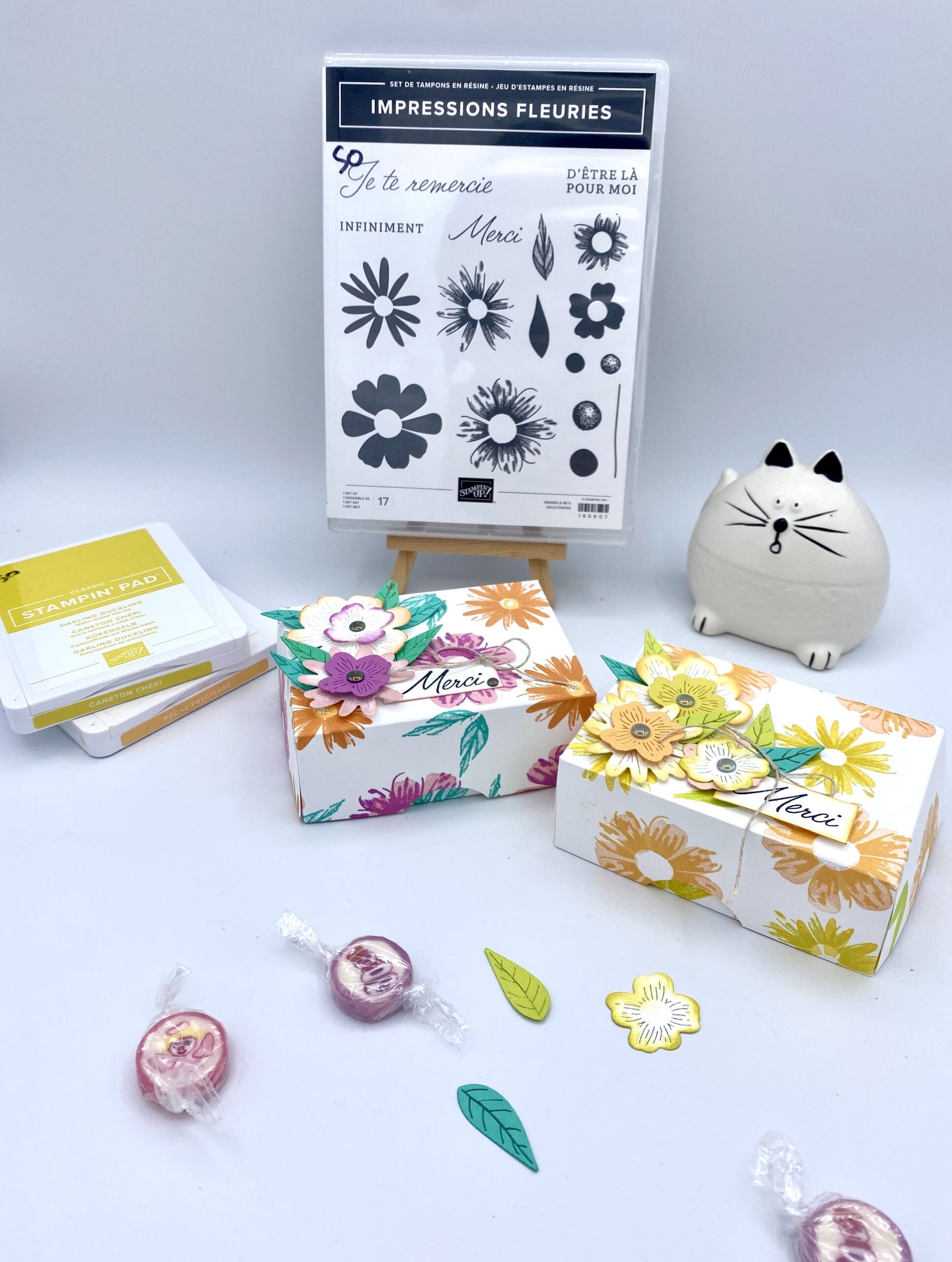 Voici le projet réalisé; une boite double compartiments mais la subtilité du truc, c’est la réalisation du fond grâce au set de tampons « Impressions fleuries »