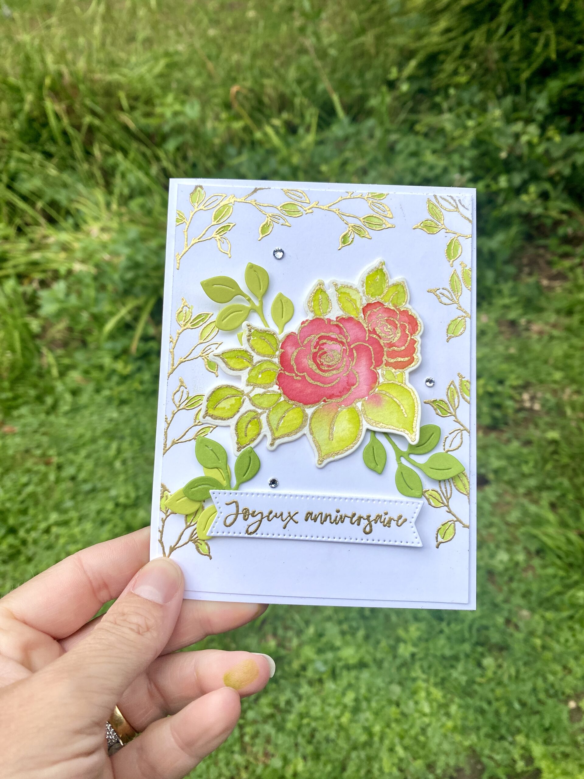 J’ai sorti mon Aqua pinter avec les encreurs Stampin’Up! ma super poudre à embosser et surtout j’ai utilisé le lot « Bouquet Amical » qui s’y prête trop bien