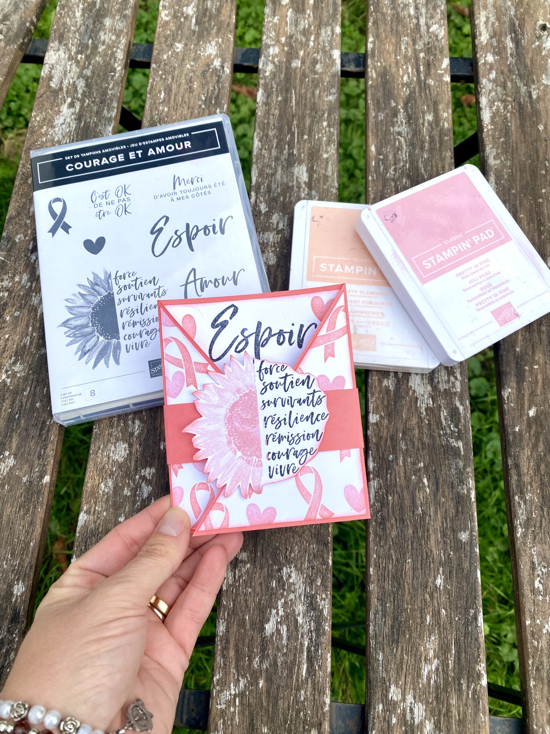 Les encres Joli Flamant et Pétale Rose s’accordent à merveille pour ce projet plein de tendresse. Un combo frais, féminin et lumineux, parfait pour transmettre un message d’amour et de soutien, pour les malades mais aussi également pour tous les aidants (Vous le savez, ça me tiens réellement à coeur)