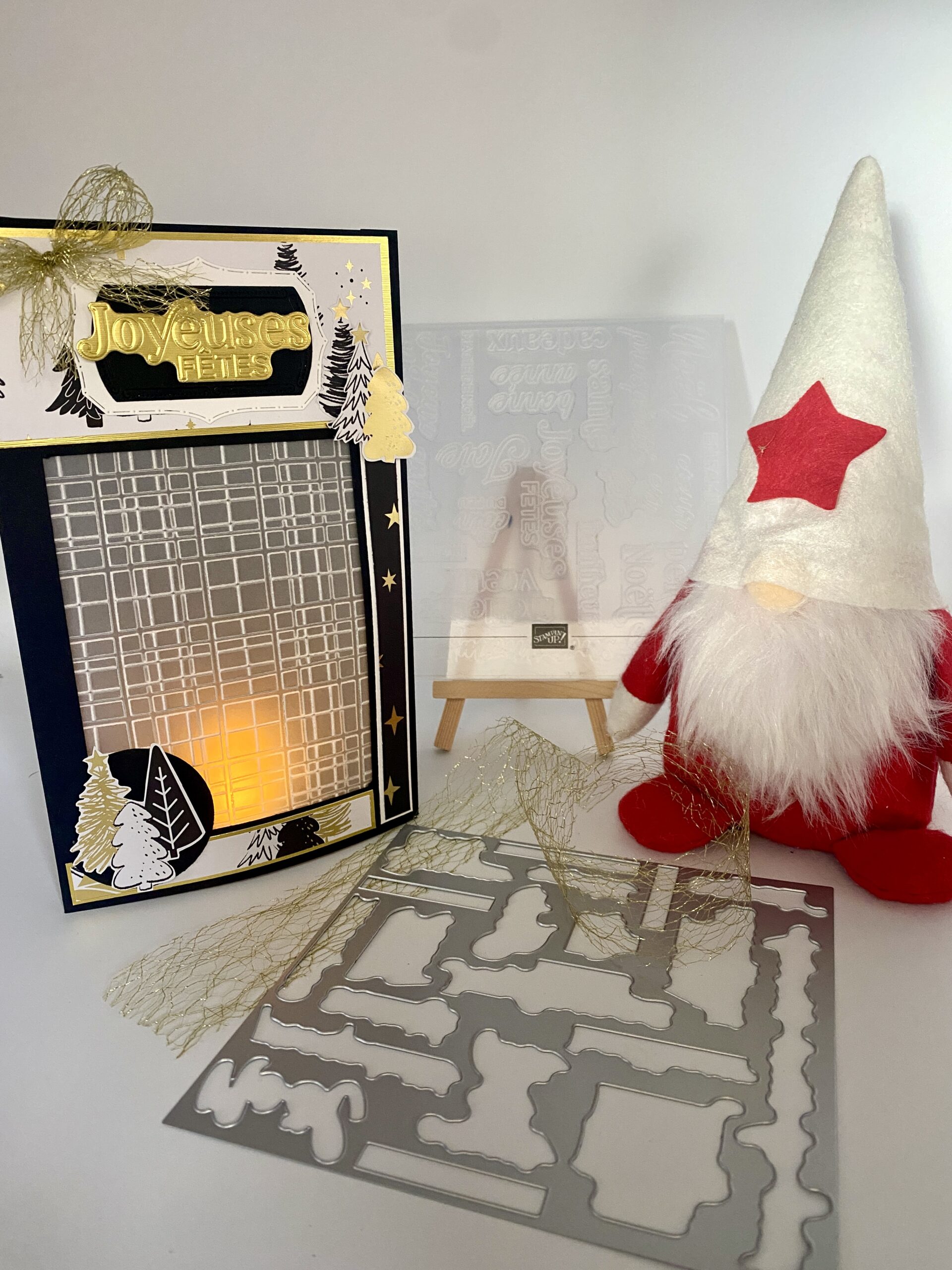 Pour ma version, j’ai utilisé le plioir “Gaufrage hybride Collage de mots de Noël” afin d’apporter du relief et de la texture à mon décor, associé au papier Vélin embossé en 3D(qui revient dans les exclu en ligne de novembre et en mode 30/30. Enfin jdis ça … ) Le rendu est juste waouh ✨ !