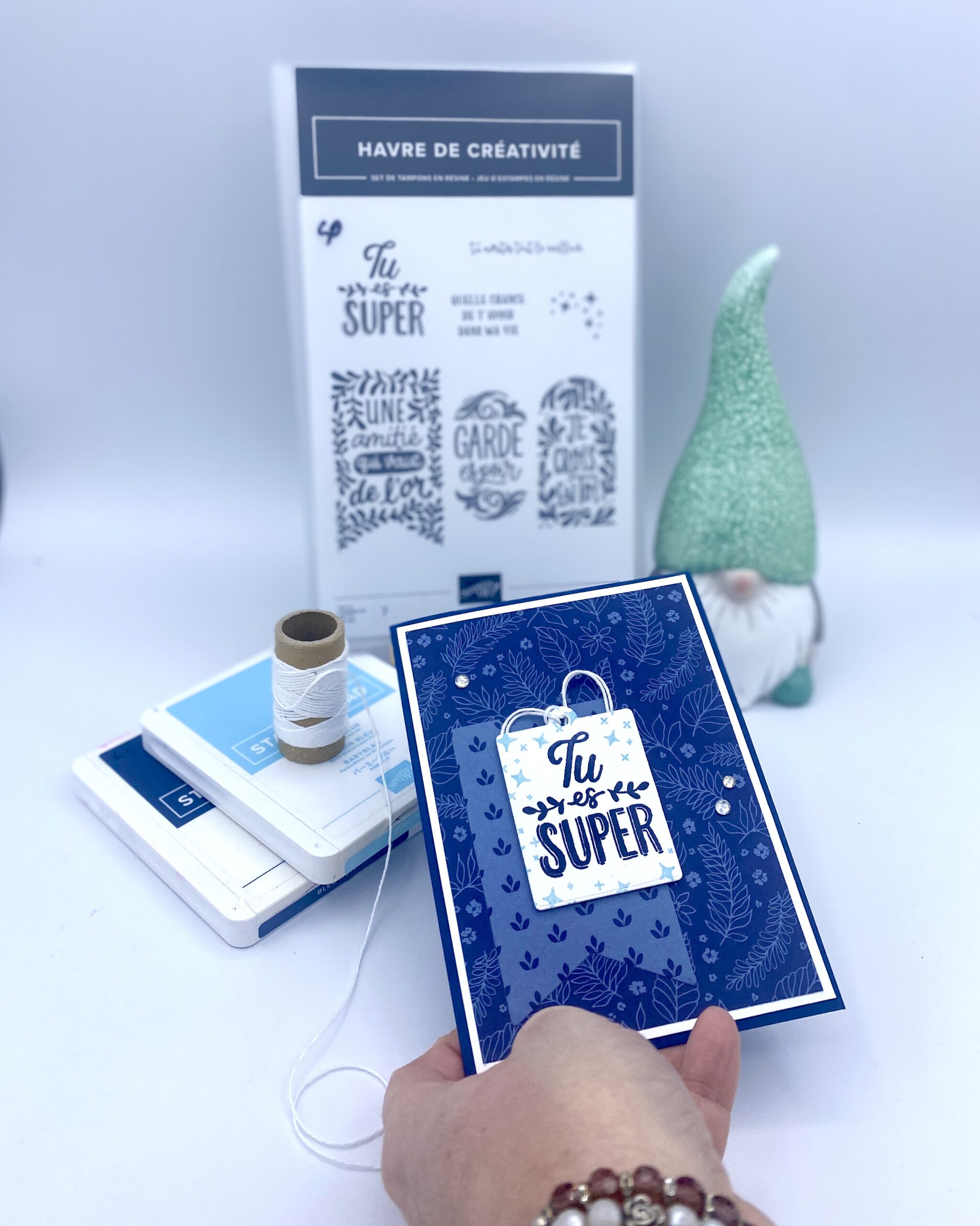 Pour cette création, j’ai travaillé avec plusieurs matages afin de donner du relief et mettre en valeur les motifs délicats du papier design. Les feuillages, les détails fins et la profondeur des bleus apportent immédiatement un effet chic et lumineux. J’ai choisi une étiquette centrale avec le message « Tu es Super », parfait pour offrir à une amie, remercier quelqu’un ou simplement faire plaisir.