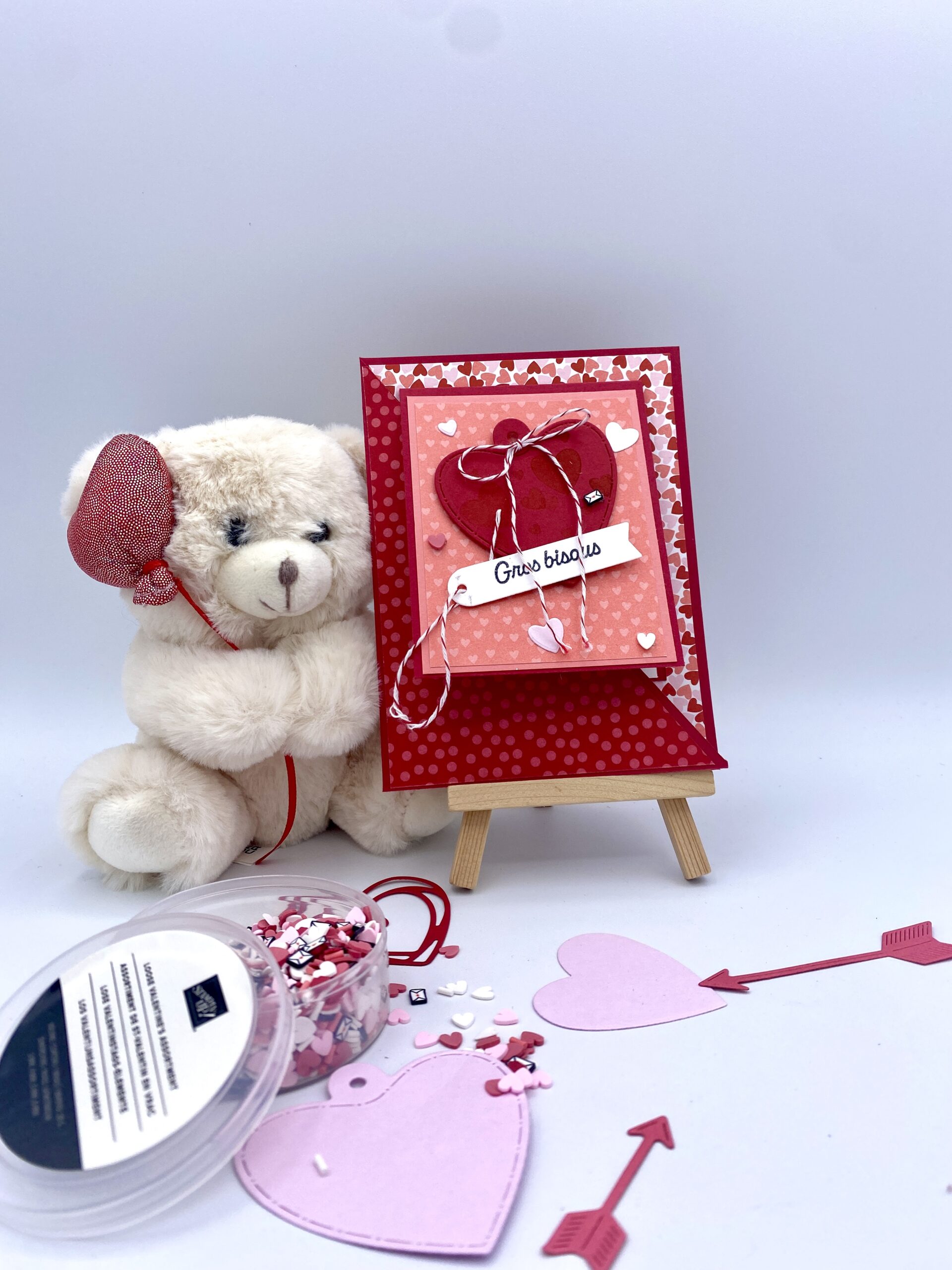 Pour ce projet, j’ai utilisé le lot Amour Sans Fin, que j’adore particulièrement pour ses formes de cœurs et ses messages intemporels. Le papier design Fait avec Amour apporte une touche douce et romantique, idéale pour la Saint-Valentin. c’est très chichipanpan et je suis fan lol