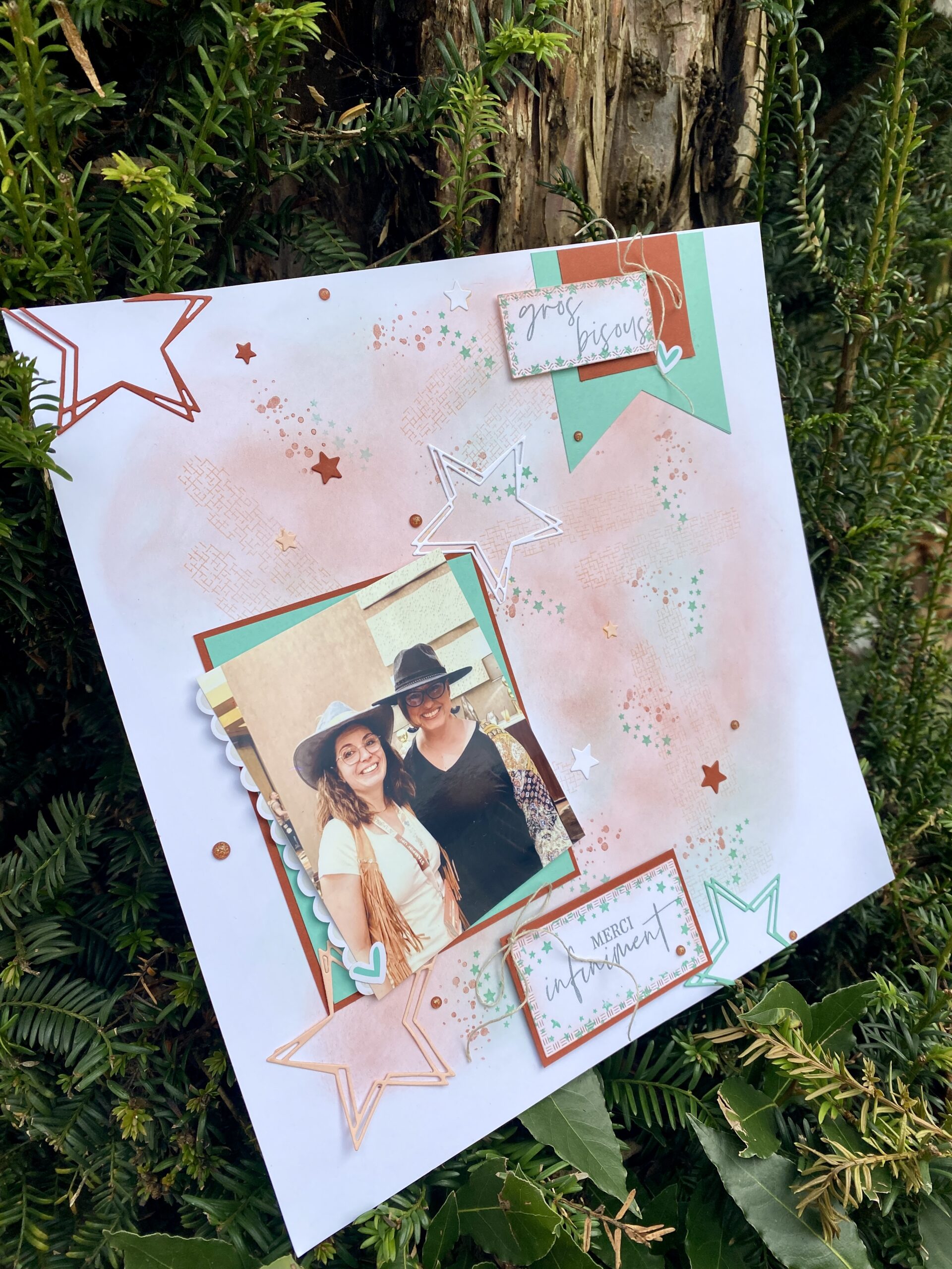 Pendant ce live, j’ai réalisé une page de scrapbooking au format 30×30 sur une base de papier blanc. J’avais envie d’un fond travaillé mais léger, avec de la matière, sans jamais voler la vedette à la photo.