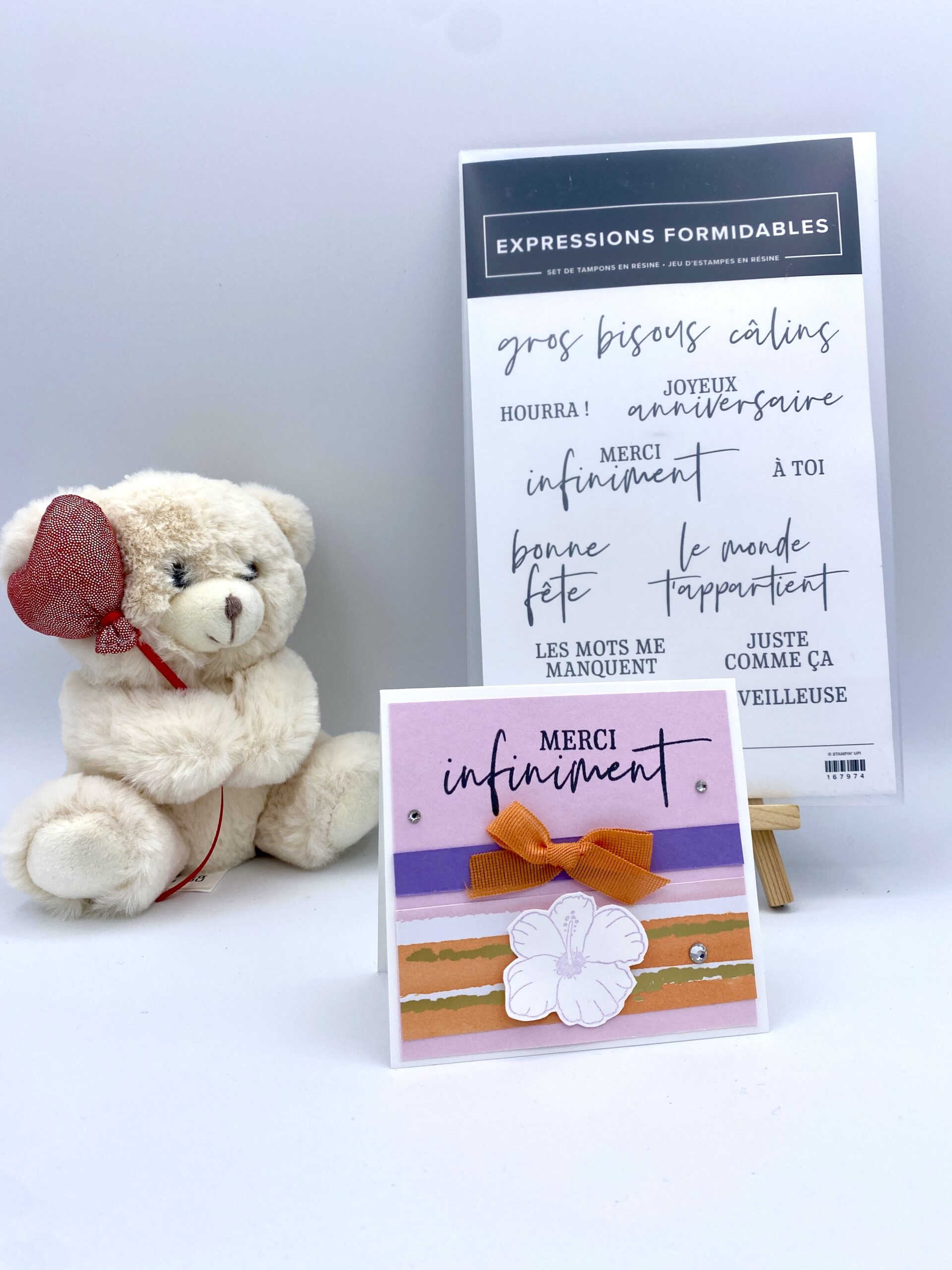 Pour cette carte de remerciement, j’ai utilisé le set de tampons Expression formidable. C’était le produit du mois de janvier chez Stampin’ Up, proposé à seulement 6 euros dès 90 euros d’achat. Autant dire que j’en ai largement profité. (toujours dispo sur la boutique en ligne, enfin jdis ça … ref 167 974)
