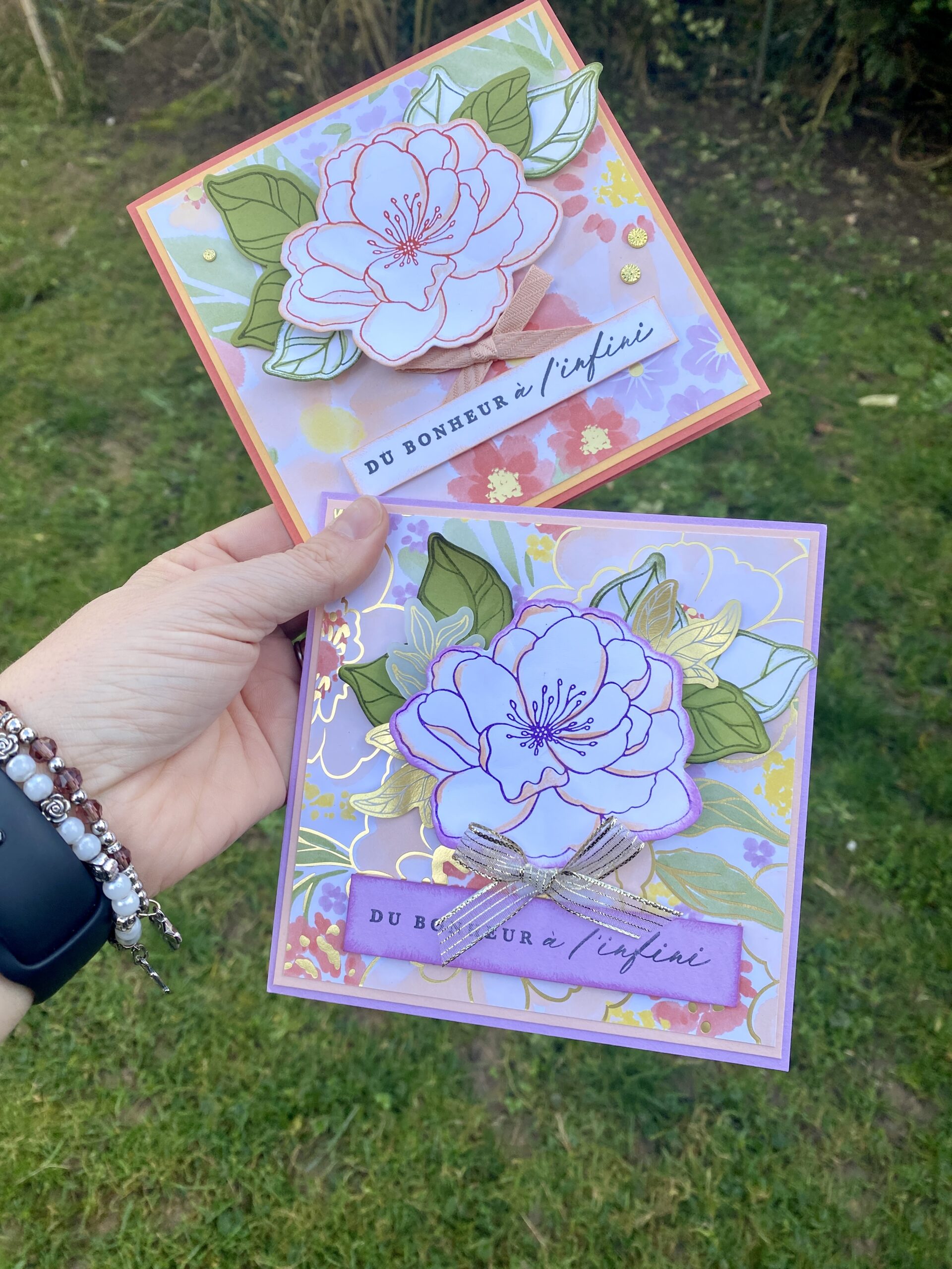 Mais comme on était en live participatif (et que j’aime vous laisser un peu décider, même si j’ai toujours une petite idée derrière la tête…), on a aussi exploré une seconde version avec Freesia en fleur, Pétale de rose et Vert olive. Résultat ? Une carte tout aussi élégante, mais avec une ambiance encore plus délicate et poudrée.